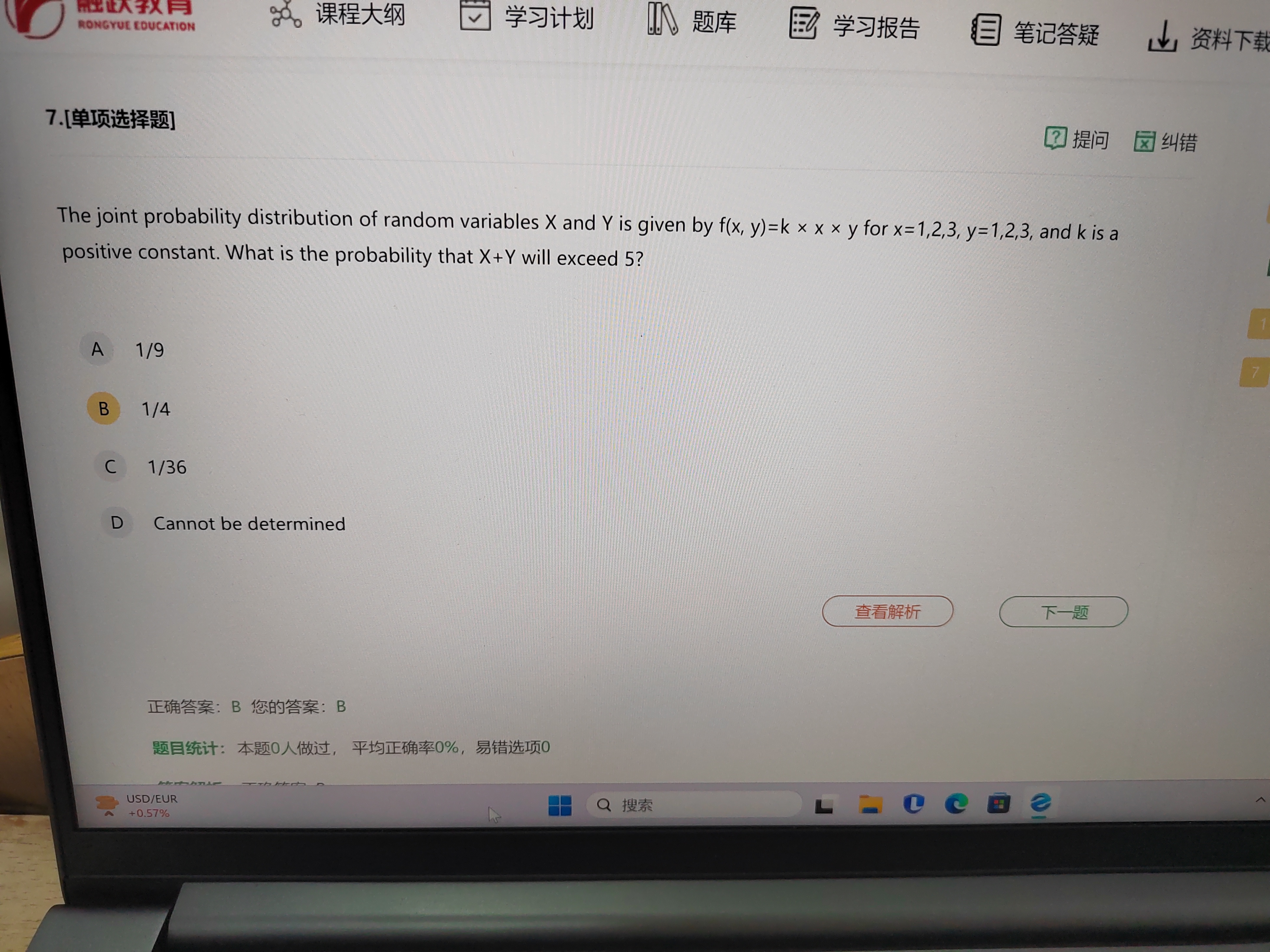先把k算出来。x的取值有3种,y的取值有三种,画一个3*3的列联表,可以把xy在不同取值下的乘积算出来,根据联合概率的表达式,乘积当中要带上k,最后把9种情况汇总起来,根据概率的公理,所有情况的概率只和应该等于1,可以把k求解出来。题目让算x+y大于5的概率,只有x取3,y取3的时候,概率大于5。所以把k,x=3,y=3带入联合概率的公式,就能算出来答案了