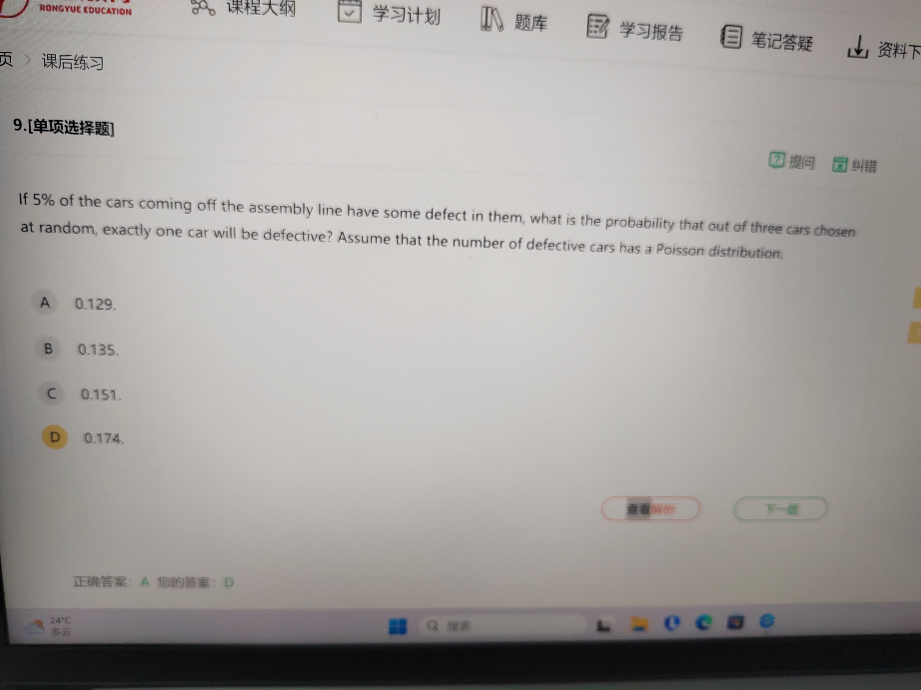 既然是服从泊松分布,那么先要把lambda算出来,lambda表示的是单位间隔内随机事件发生的次数,题目最开始给的1辆车有缺陷概率是5%,现在既然问的是3辆车,所以要把“单位间隔”扩展到3,基于lambda=np,可以算出lambda等于3*0.05=0.015。lambda算出来以后,带入泊松分布计算概率的公式,因为题目说了三辆车中其中一个有缺陷,所以令X=1,算出最后的结果