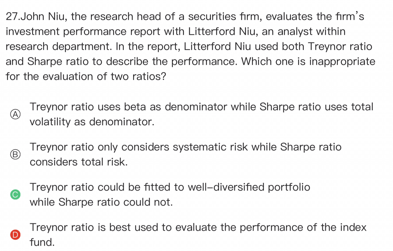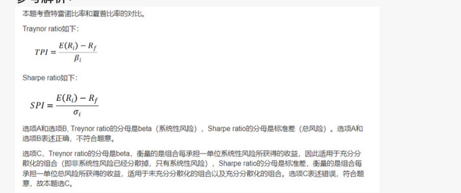 夏普比率虽然不是非常匹配完全分散化的组合,但是如果用也是可以的,但是C选项说夏普比率不适用于完全分散化的组合