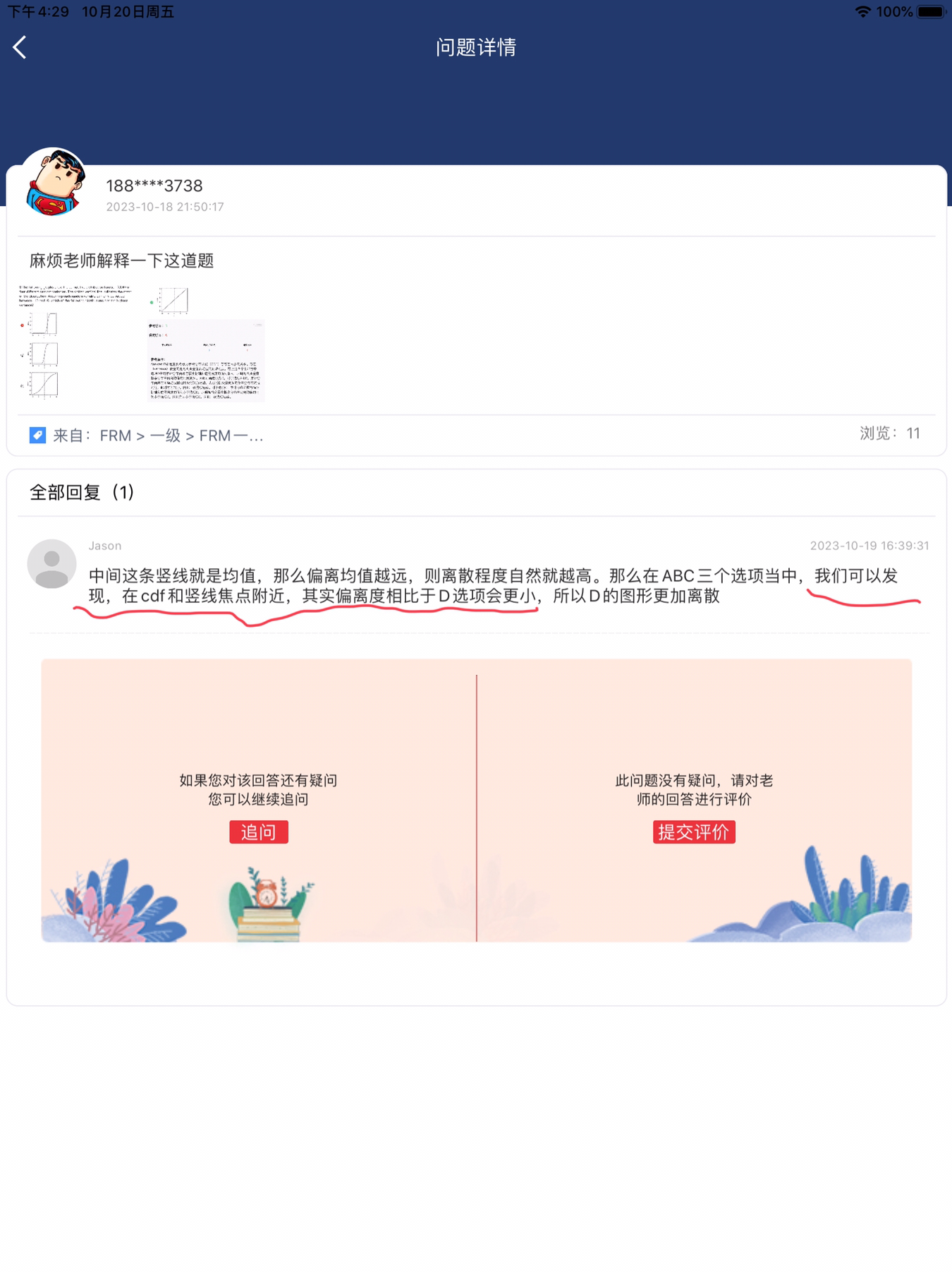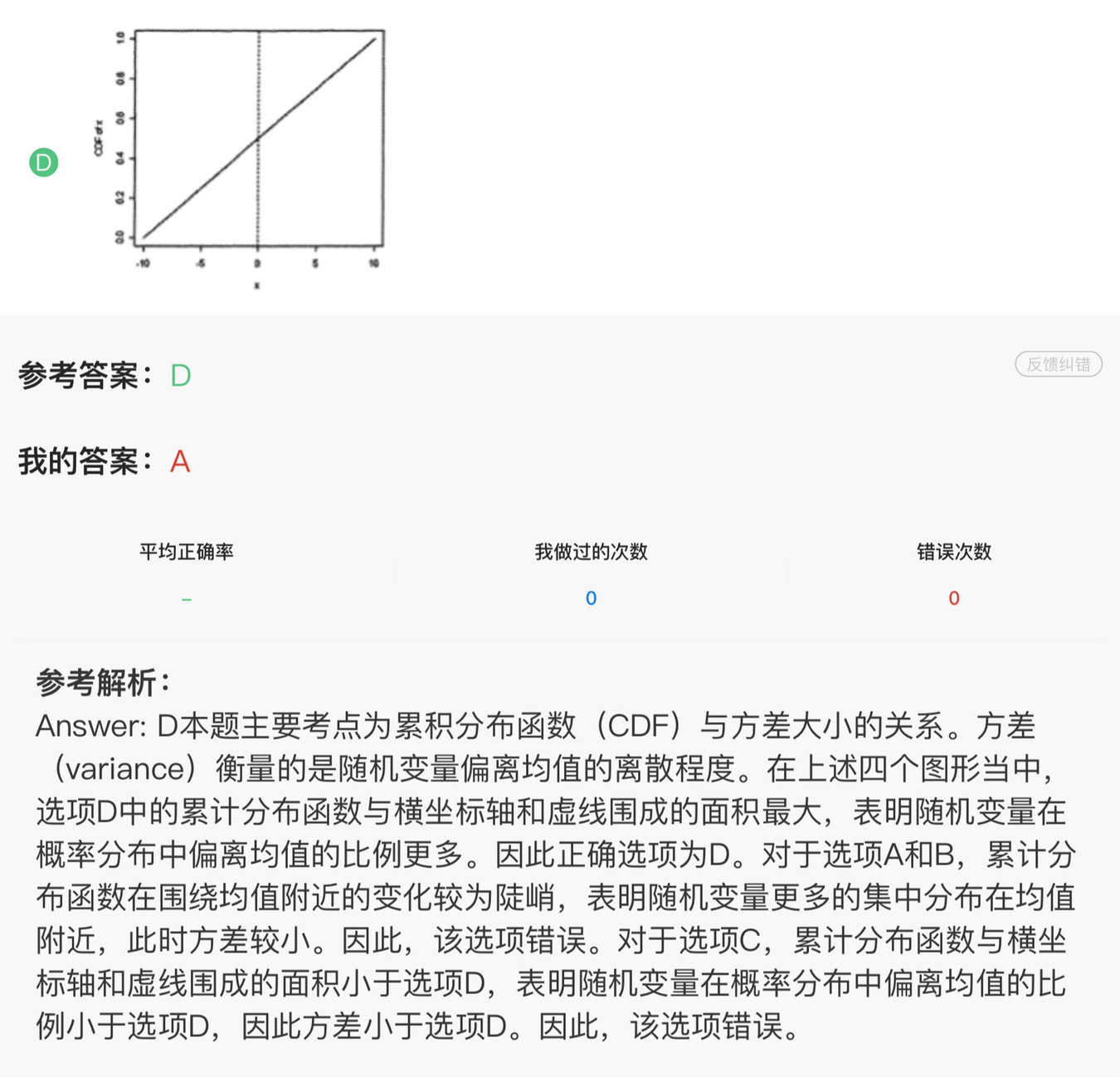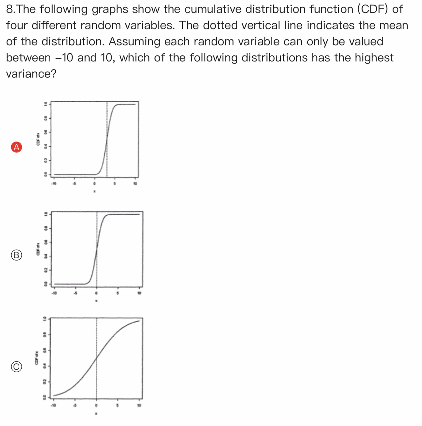 中间这条竖线就是均值,那么偏离均值越远,则离散程度自然就越高。那么在ABC三个选项当中,我们可以发现,在cdf和竖线焦点附近,其实偏离度相比于D选项会更小,所以D的图形更加离散