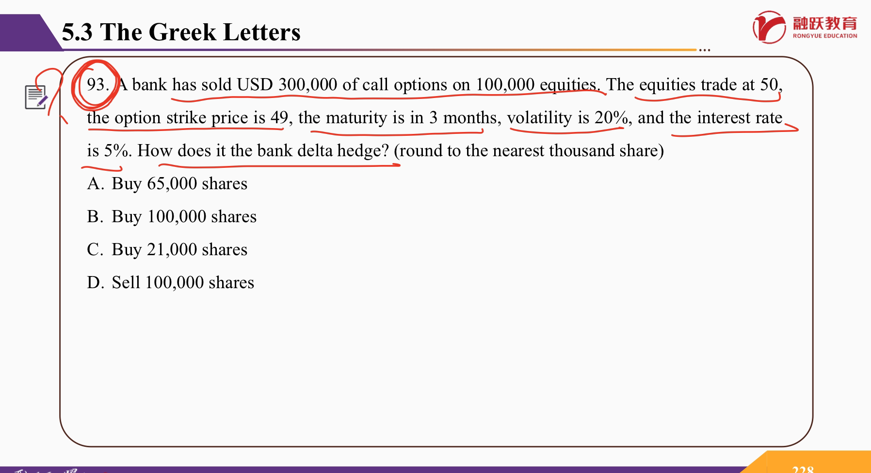 这个和你前面问的题目差不多。构建等式:option value change=delta*underlying asset change.现在题目说了期权覆盖了10万份股票,delta等于0.5。这里要做个公式的小变形,计算的不是期权价值的变化,而是用等式,通过期权覆盖的标的资产的数量和delta,计算当前的总delta。带入公式就可以算出现在总共的delta大概是5万左右,然后对应的,因为是买期权,所谓delta为负,要实现对冲,就买入5万左右的股票即可。
