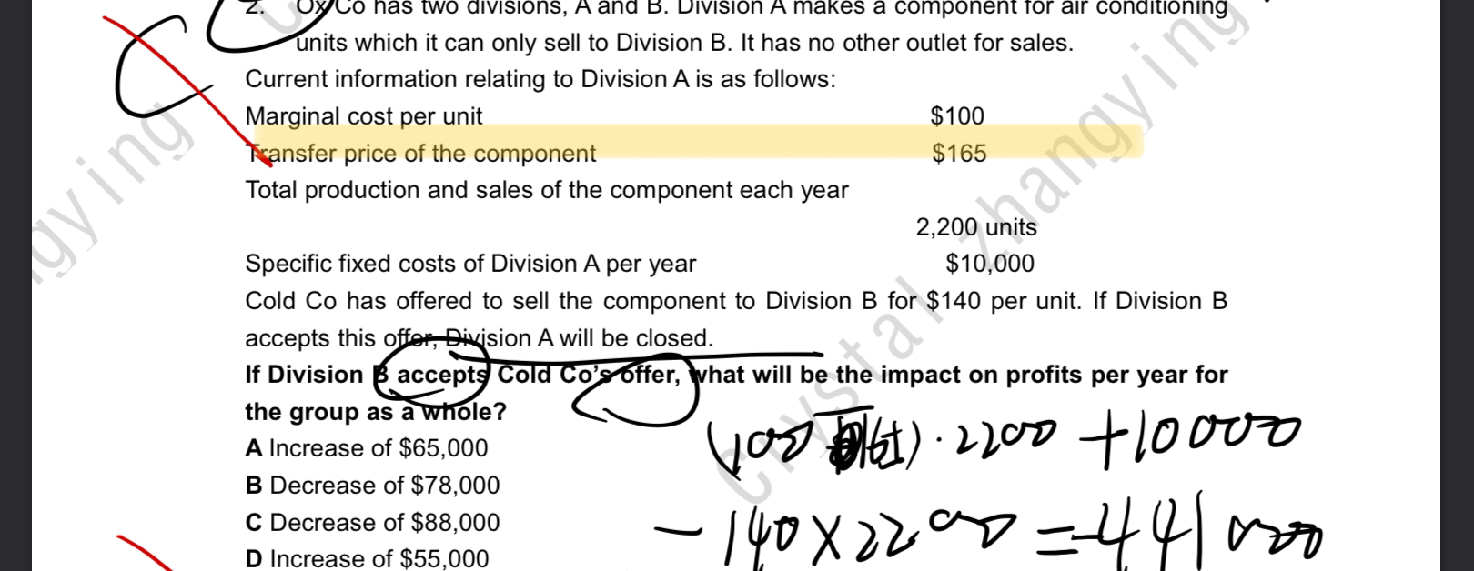 同学,题目是需要计算the group as a whole的利润影响,tranfer price是集团内部之间的交易,对整个集团是没有任何影响的。