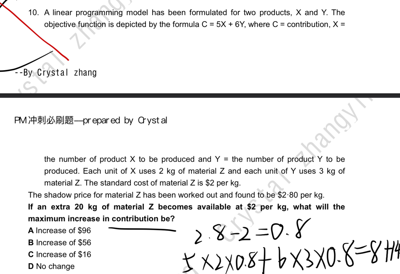 同学,shadow price定义就是增加1kg的material Z,增加的contribution是多少,现在Z是稀缺的,向外购买的2.8,那么20kg的Z向外购买就是20*2.8=56,对contribution的影响就是增加56。