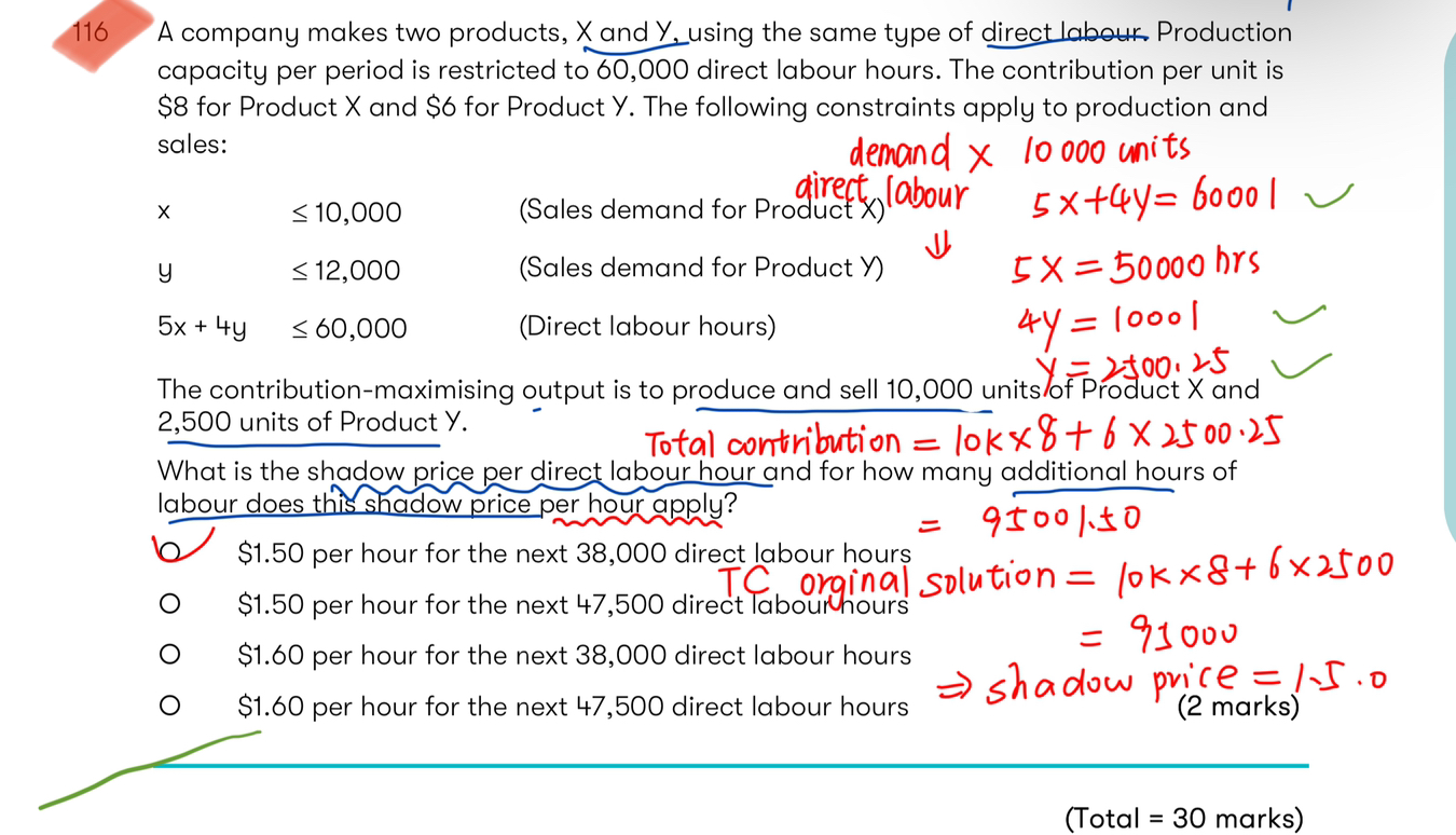 同学,shadow price是每增加1的contribution需要多增加多少稀缺资源,使用公式计算5x+4y=60001【增加1】x=10000来求解,然后代入计算contribution,将原始的contribution和现在的相减就是shadow price。