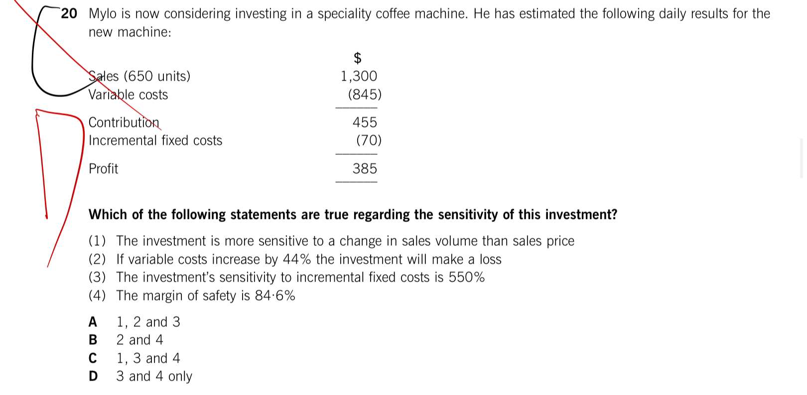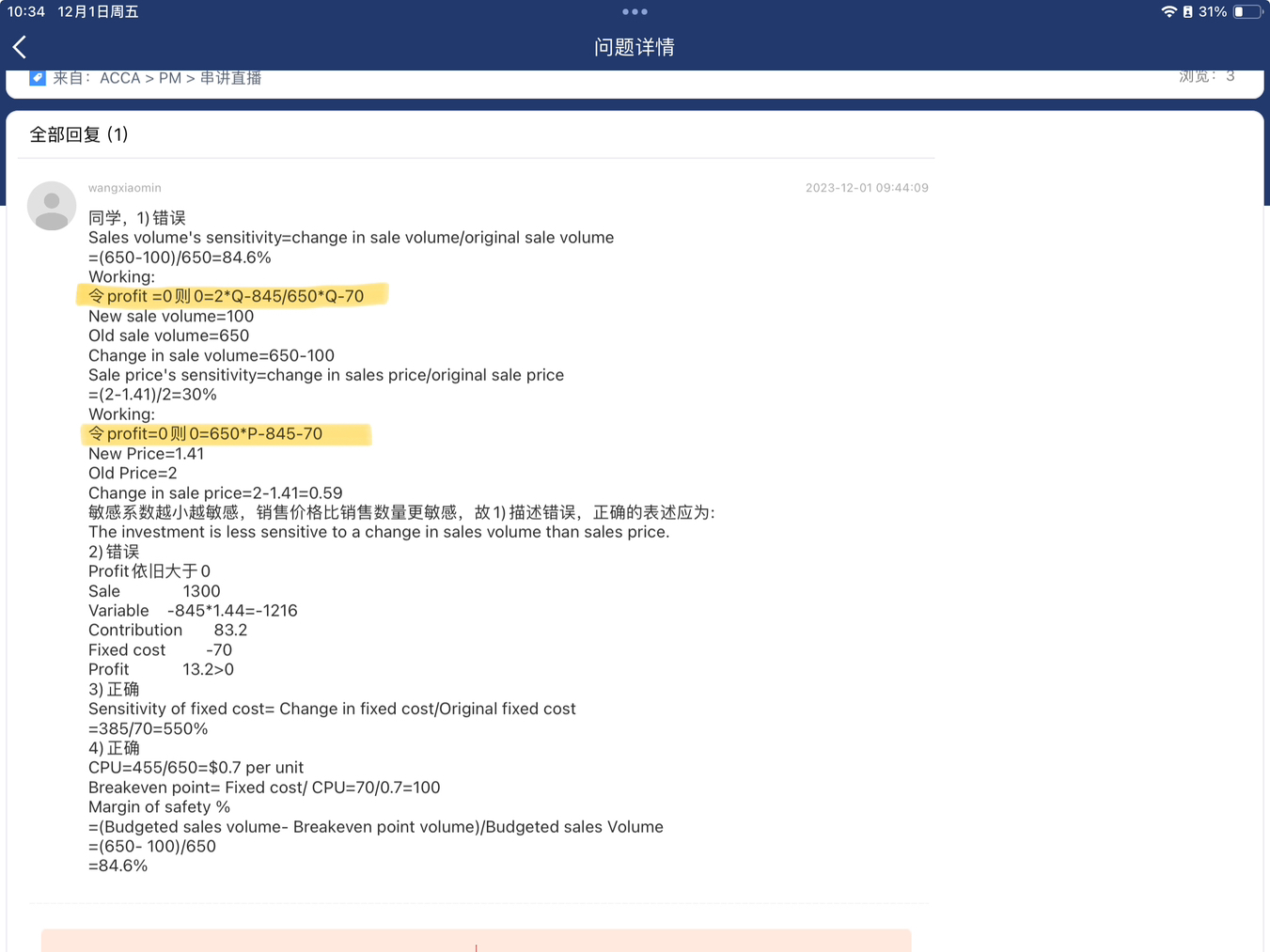 同学,1)错误 Sales volume's sensitivity=change in sale volume/original sale volume =(650-100)/650=84.6% Working: 令profit =0则0=2*Q-845/650*Q-70 New sale volume=100 Old sale volume=650 Change in sale volume=650-100 Sale price's sensitivity=change in sales price/original sale price =(2-1.41)/2=30% Working: 令profit=0则0=650*P-845-70 New Price=1.41 Old Price=2 Change in sale price=2-1.41=0.59 敏感系数越小越敏感,销售价格比销售数量更敏感,故1)描述错误,正确的表述应为: The investment is less sensitive to a change in sales volume than sales price. 2)错误 Profit依旧大于0 Sale 1300 Variable -845*1.44=-1216 Contribution 83.2 Fixed cost -70 Profit 13.2>0 3)正确 Sensitivity of fixed cost= Change in fixed cost/Original fixed cost =385/70=550% 4)正确 CPU=455/650=$0.7 per unit Breakeven point= Fixed cost/ CPU=70/0.7=100 Margin of safety % =(Budgeted sales volume- Breakeven point volume)/Budgeted sales Volume =(650- 100)/650 =84.6%