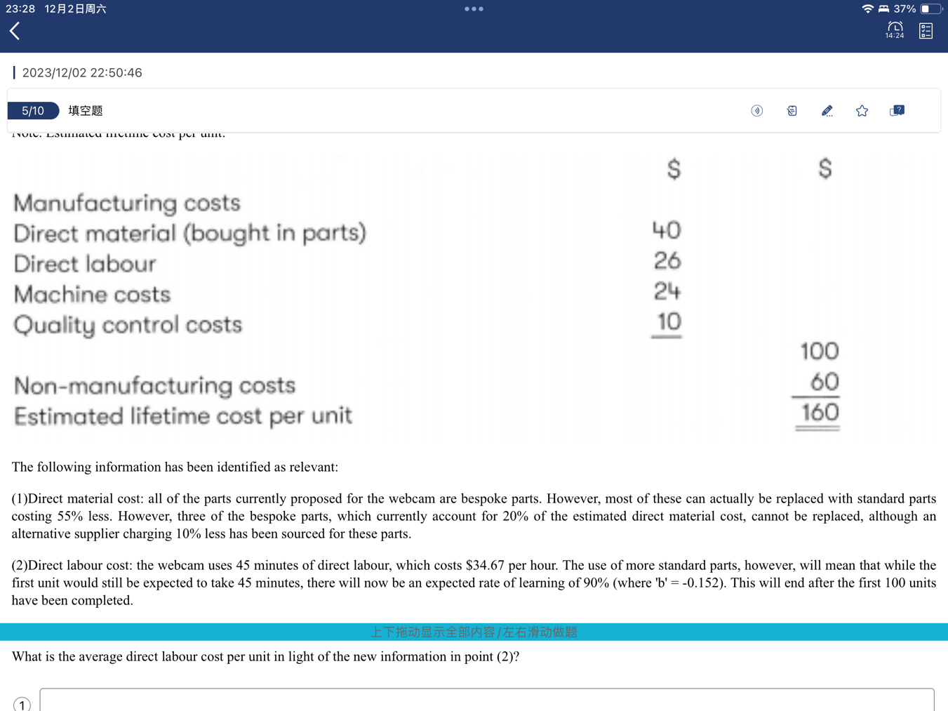 同学,Parts to be replaced by standard parts = $40 x 80% = $32 New cost of standard parts at 45%(100%- 55%)= $14.40 Unique irreplaceable parts (original cost) = $40 x 20%= $8 New cost = $8 x 90% = $7.20 Reviseddirect material cost = $14.TO+ $7.20 = $21.60
