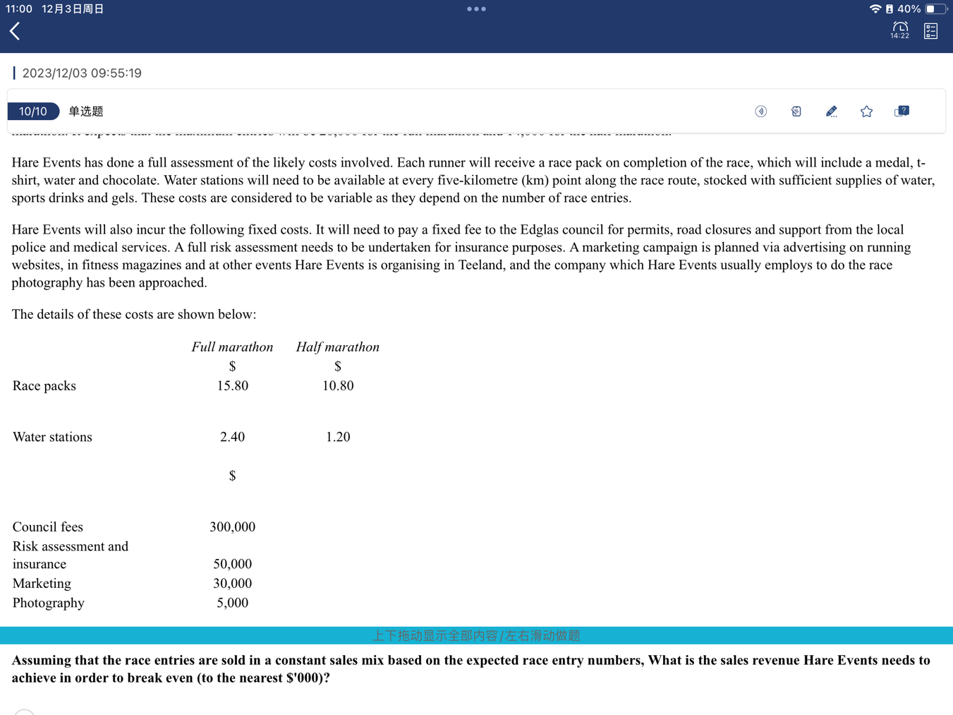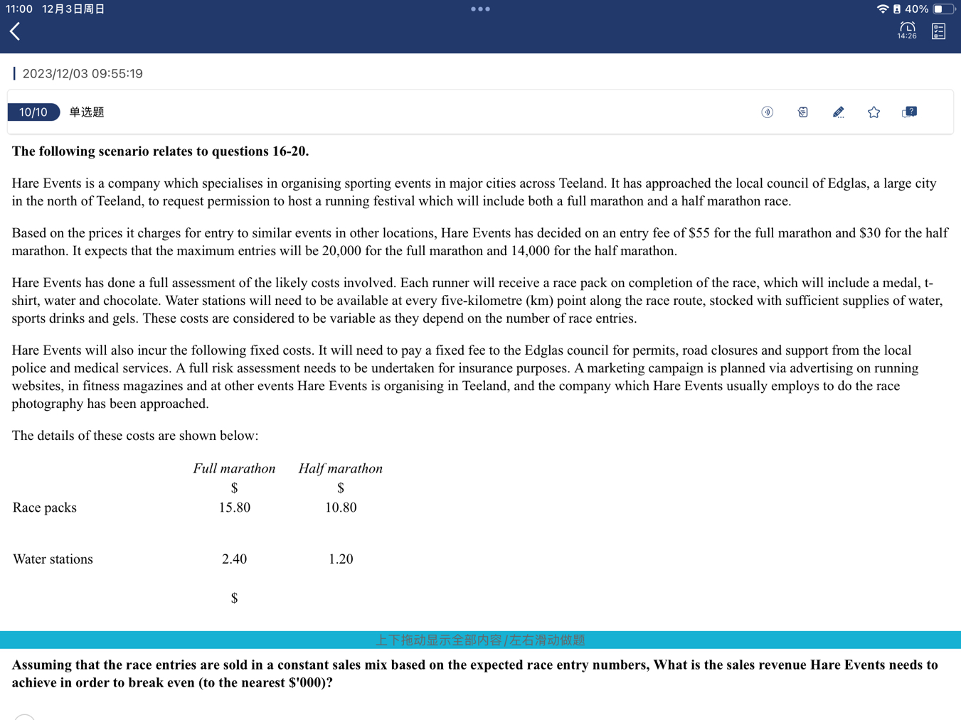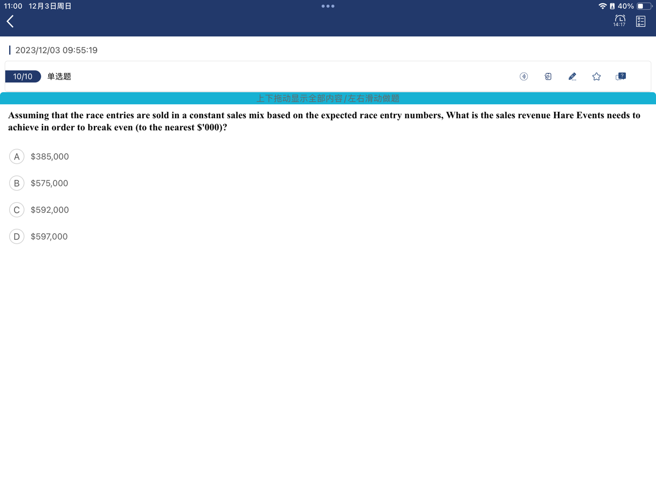 同学,Weighed average C/S ratio =(36.8*20,000+18*14,000)/(55*20,000+30*14,000) =65% BEP of revenue=Fixed cost/weighted average c/s ratio =385,000/65% =$592,308 ≈$592,000