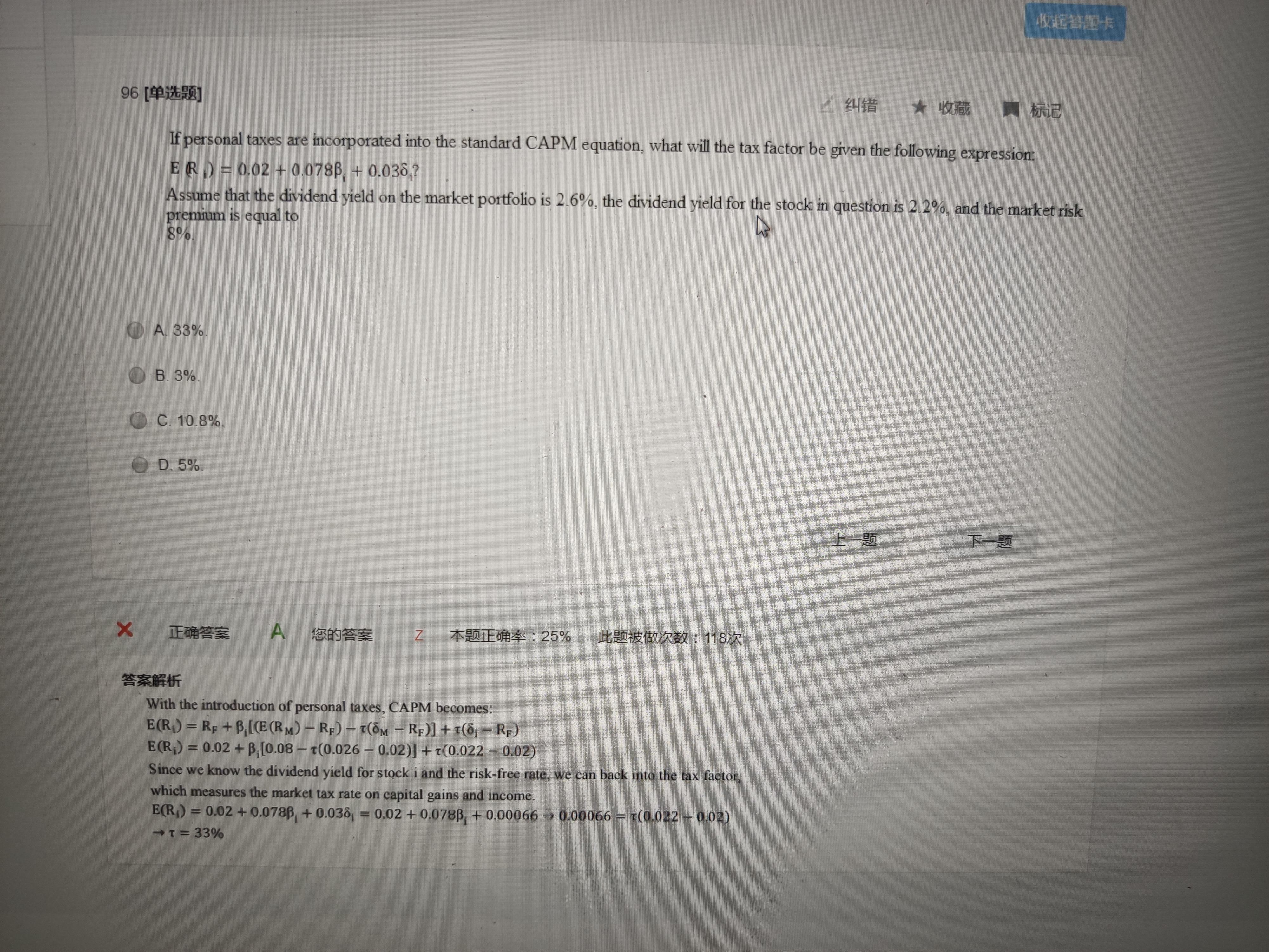 同学你好,关于tax在frm里讲的不多,前导班里应该有讲税钝效应。题目当中如果出现tax,一般会给到使用的方法,不是考察的主要知识点,就像这道题这样,考察的内容是CAPM。