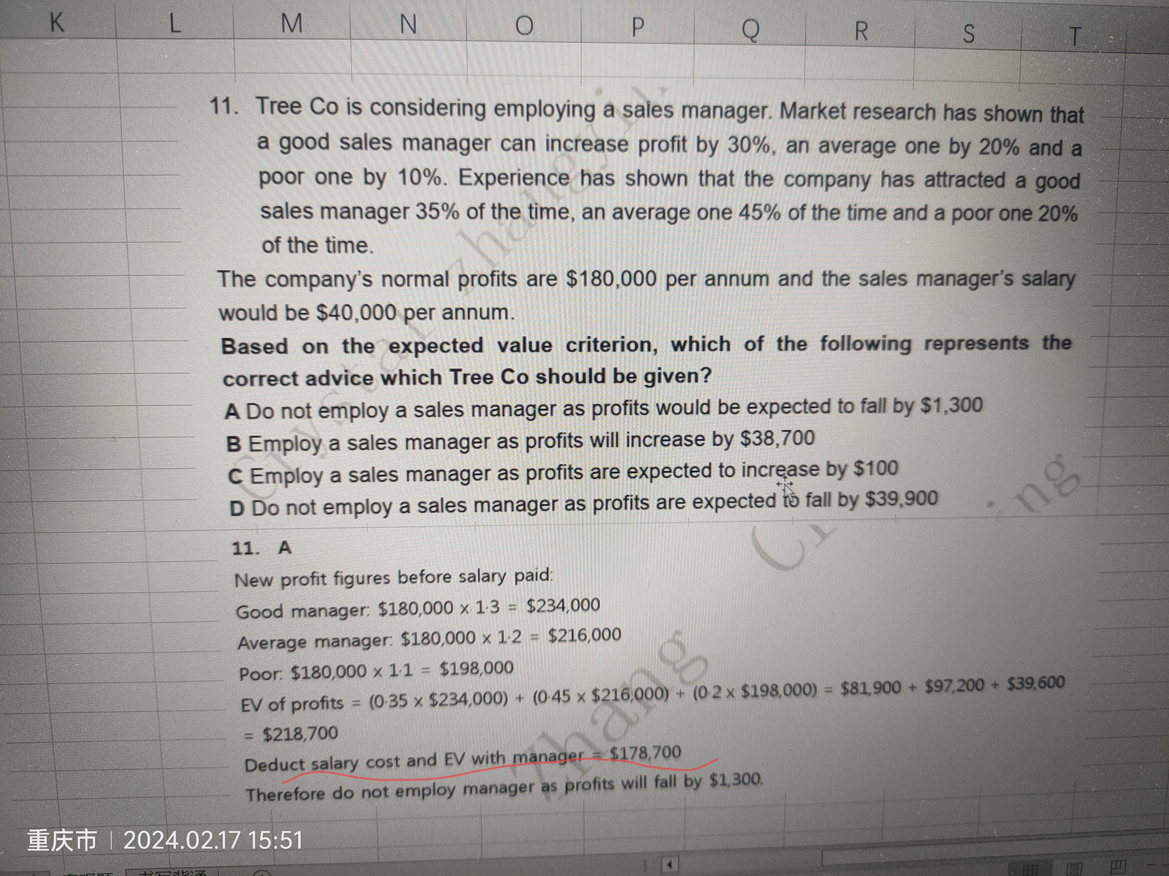 同学,这部分是利润增加,但是还会有销售经理的年薪这个成本需要扣除,218700-40000=178700,这才是最终的利润。