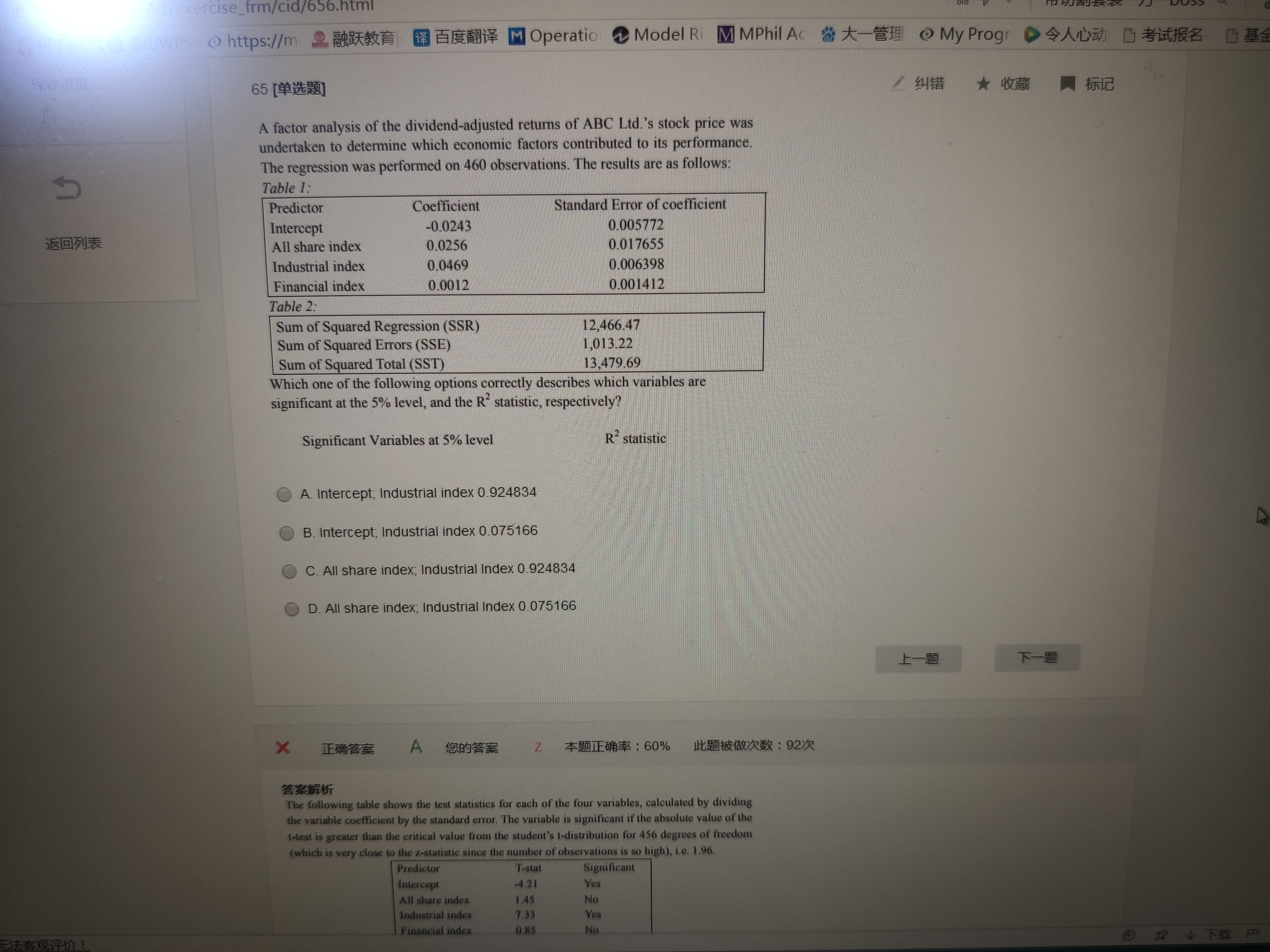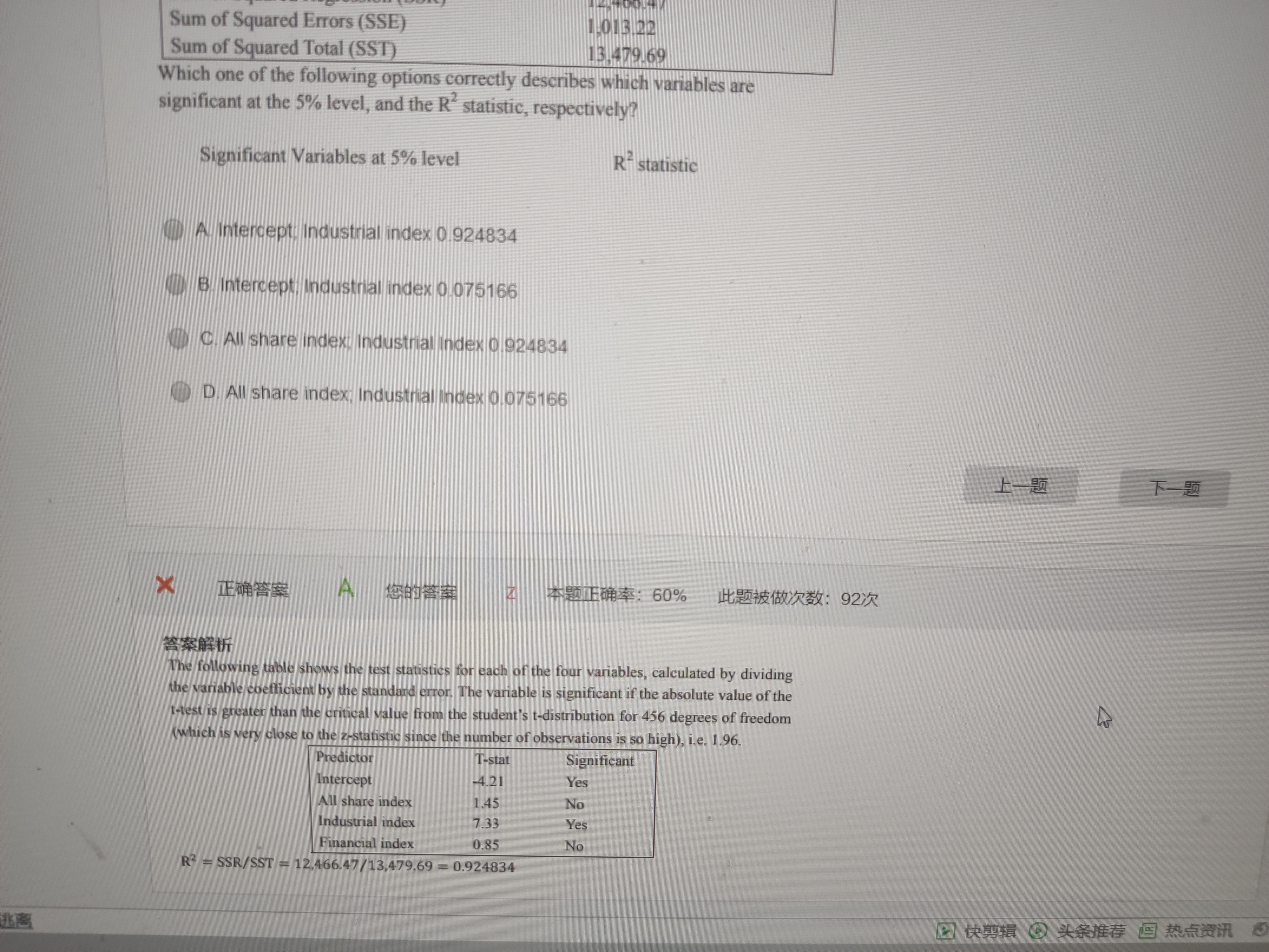 按照答案的意思,他就直接把coefficient除以了standard error of coefficient 但是我觉得standard coefficient还在再除根号n 解释一下 谢谢