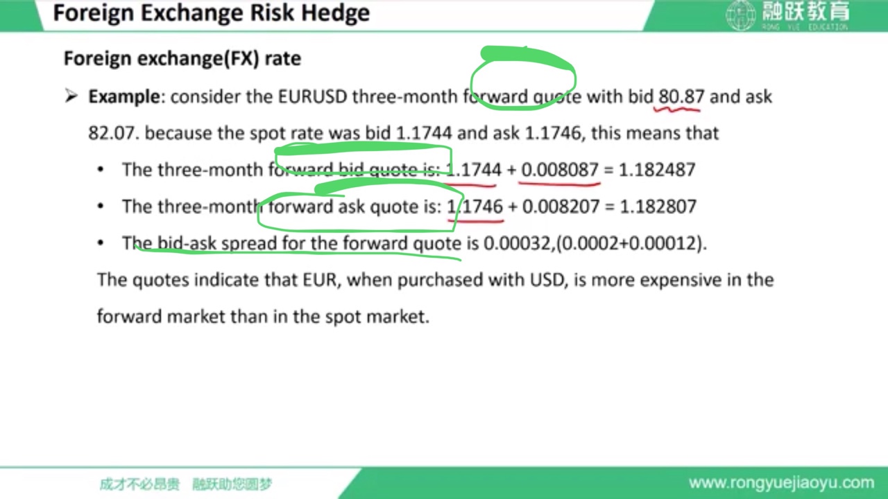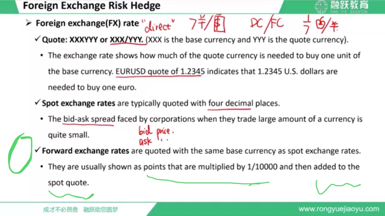 网课讲义中Calculate bid-ask spread中讲到了即期利率的bid-ask spread 和远期利率的bid-ask spread 的计算方法,其中即期利率的bid-ask spread 就是ask price-bid price,而远期利率就是网课视频中讲到的在即期利率的bid 和 ask 基础上各自加上远期利率报价基点除以10000得到的,然后再相减得到远期利率的bid-ask spread。考纲中其实对这个知识点也没有讲很多,看懂讲义中这个例题就可以了。我把网课中的该部分讲义找出来,重点看下划绿线的部分。