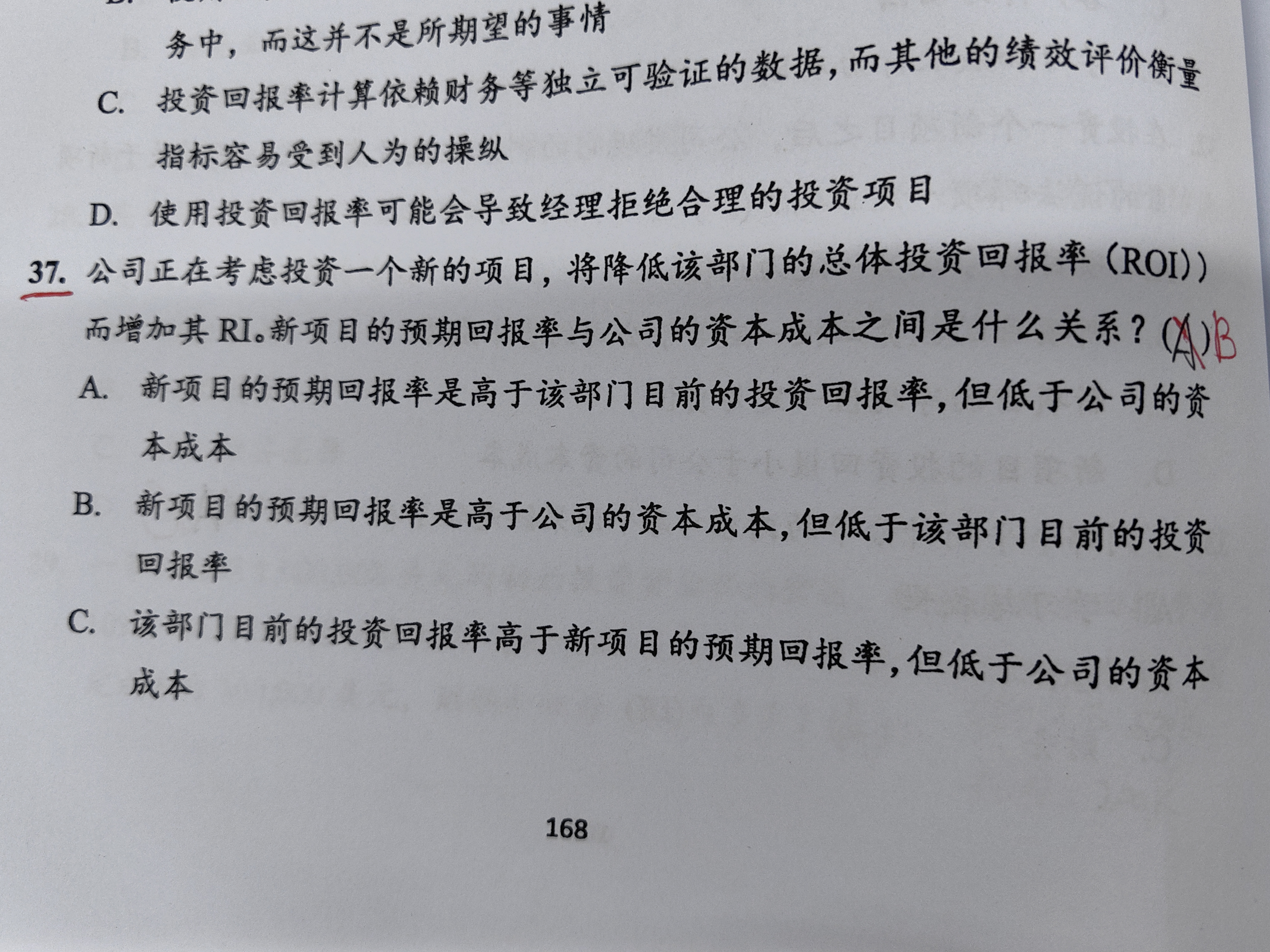 同学你好,①当新项目的投资回报率低于部门投资回报率的时候,如果采纳新项目,就会拉低部门的投资回报率,所以一般部门不愿意接受低于部门投资回报率的项目。②剩余收益RI=业务单元的利润 –(业务单元的资产 × 要求报酬率)。也就是新项目的投资回报率大于必要报酬率,这个新项目就是可以的。因为对于整体公司是有利的。③公司的资本成本指的就是公司的必要报酬率。