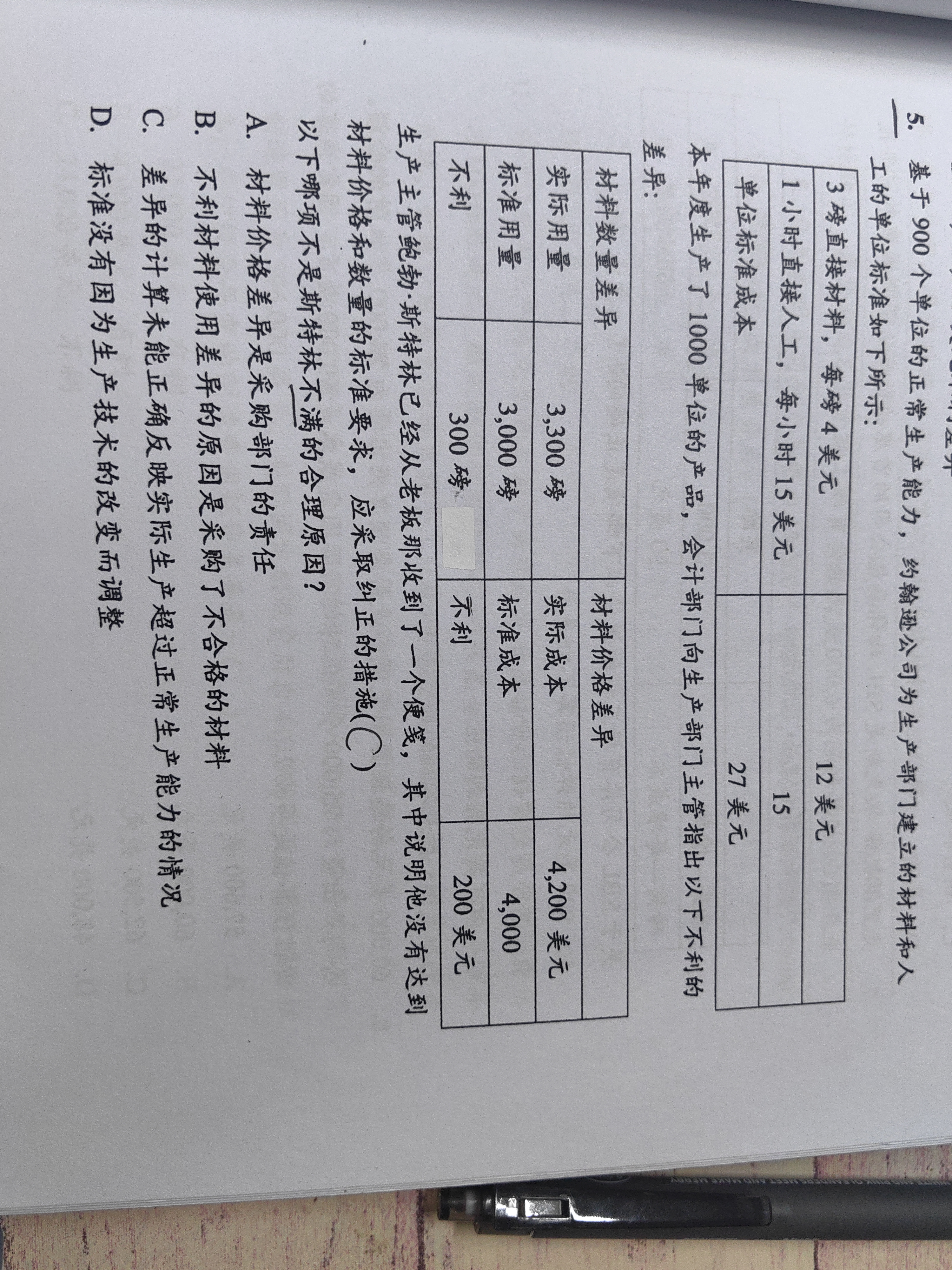 同学你好,斯特林作为生产部门的经理,他不满也就是不是他的责任放在了生产部门了。不是不满的原因,也就是这项原因不是可以给生产部门推脱的理由。A选项:价格差异一般是采购环节的责任,所以不是生产环节,生产经理的责任。是斯特林可以作为不满的理由。B选项:由于原材料的质量问题使生产环节原材料使用量增加,所以是采购环节的问题不是生产环节的问题。同样可以是是斯特林不满的理由。C选项:差异比较的是实际结果与弹性预算的结果。弹性预算是实际产量下的标准结果。所以两者之间的比较是同一产量下的,数量上是一样的。不涉及实际产能与正常产能的问题,一般涉及到产能的差异是固定制造费用。所以这个原因不是斯特林可以推脱的理由。这道题目选择C选项。D选项:生产技术还没有提高,但是标准设置的太高,那就是设置标准的人的责任,同样不是生产部经理的责任。