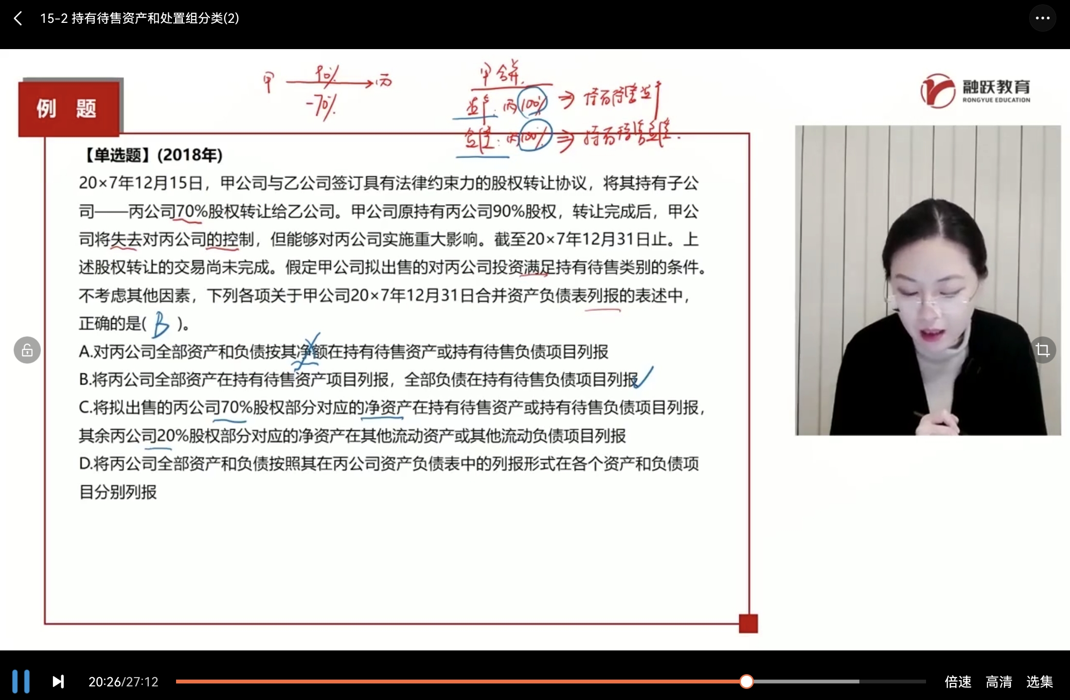因为甲公司要把丙公司转让给乙公司,所以对于甲来说,丙公司属于持有待售了,在合并资产负债表里,就要将丙公司相关科目放在持有待售类别里。