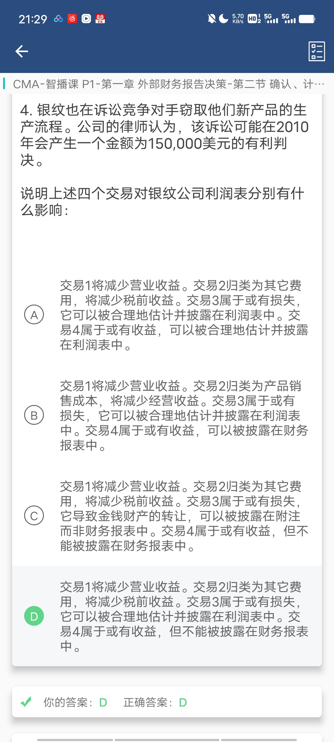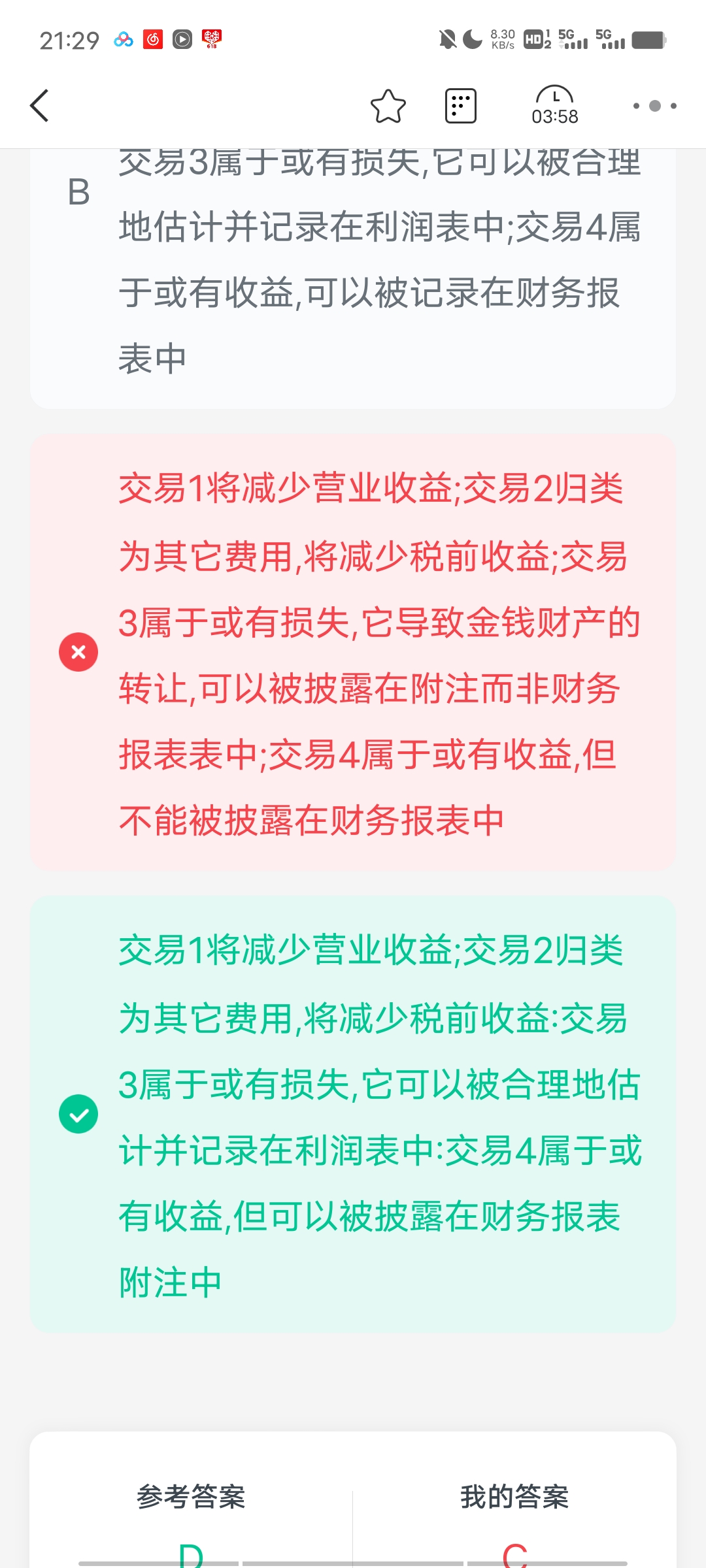 同学你好,或有收益不被记录在财务报表中,当或有利得发生的可能性较高的时候,可以在附中中披露。第一张图片中写的是“可能”,概率很低,不能记录在财务报表中,也不需要披露在附注里面。第二张图片看不到第四个案例,如果一样的话,答案是有些问题的。