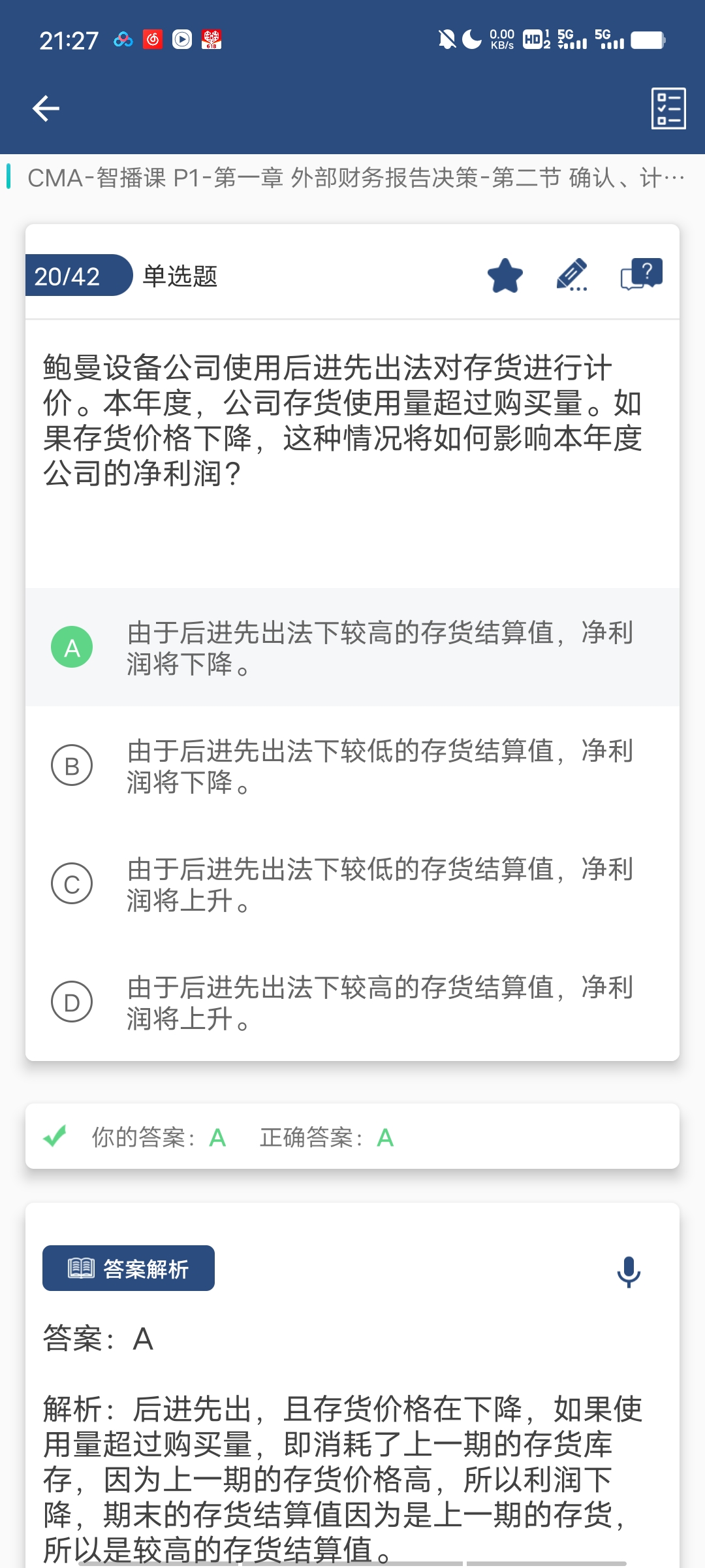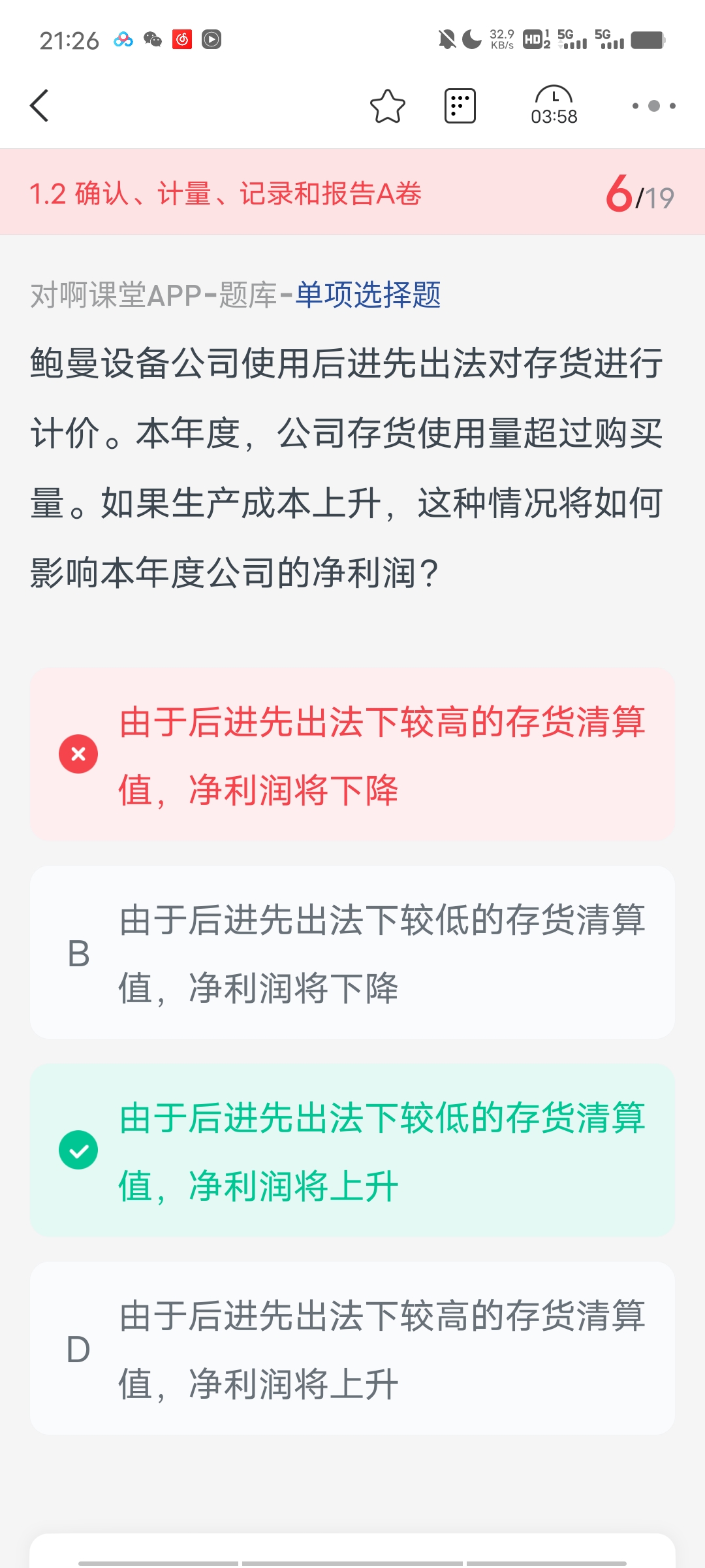 同学你好,使用了后进先出法下,那就是后面购买的东西先销售。如果本期存货使用量超过了购买量,那也就是使用了期初存货。又因为存货价格下降,所以期初存货成本高于本期采购的存货成本,那就会产生较高的存货结算值,净利润下降。