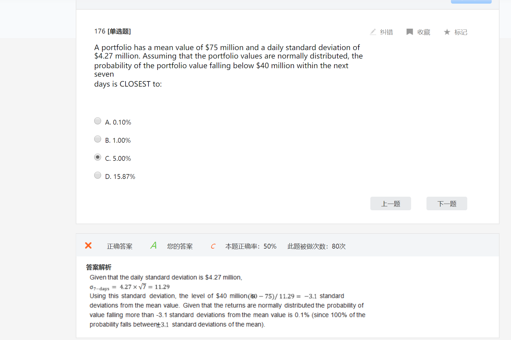 这个考察的是mean 和 standard deviation的关系,以及z table数据查询的方法。 具体就是说40这个数值距离mean有多少个standard deviation,从而用此数据结合z table来判断选项。