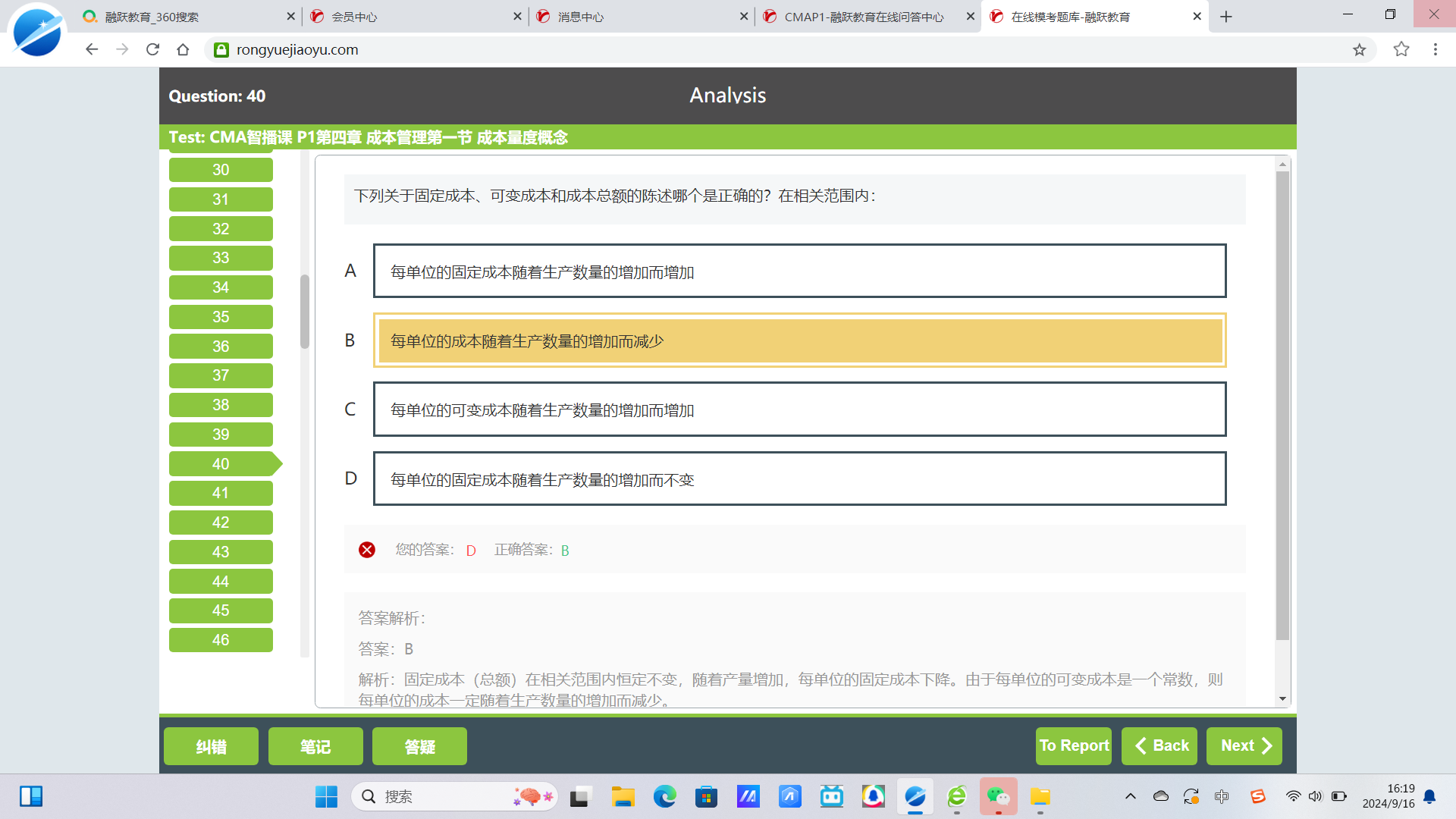 同学你好,这道题目有错误。B选项改为:每单位的固定成本随着生产数量的增加而减少。在单位范围内,总固定成本保持不变,所以随着数量的增加,单位固定成本是下降的。