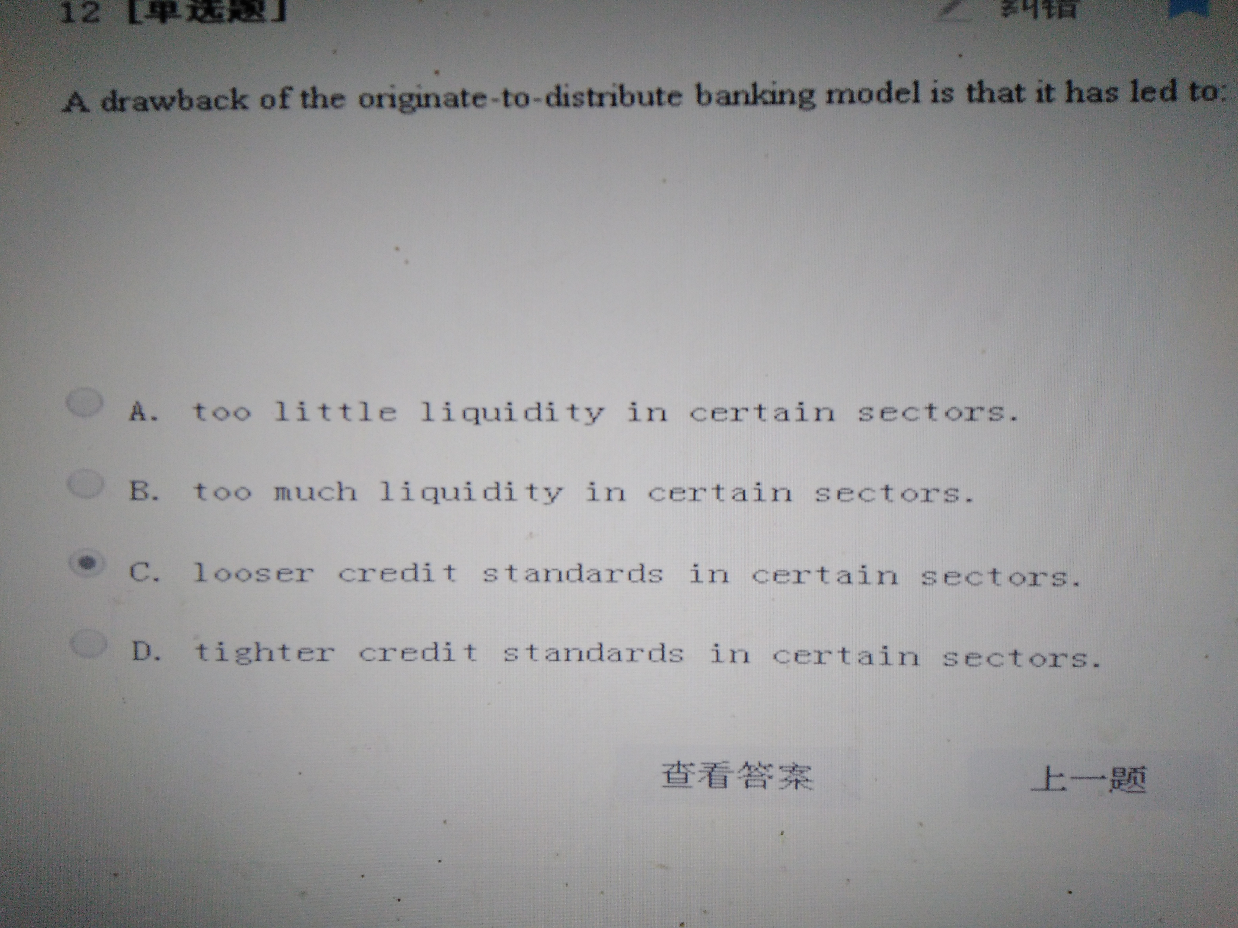 这个应该是C吧,此模式下银行就不用承担借款人的违约风险了,风险转嫁给第三方了,所以对借款人的审核就放松了。