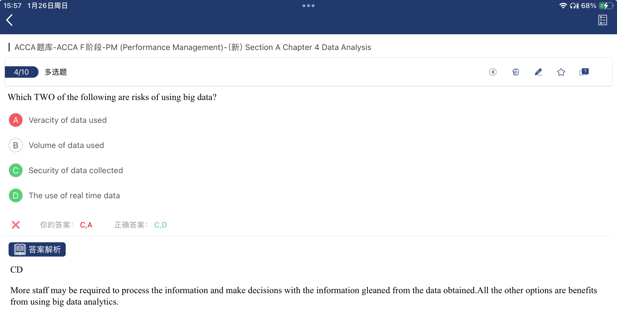 这题出的不好, varacity 确实是个缺点。 D 数据的实效性也是使用大数据的缺点。 本题ACD都可以理解为缺点。