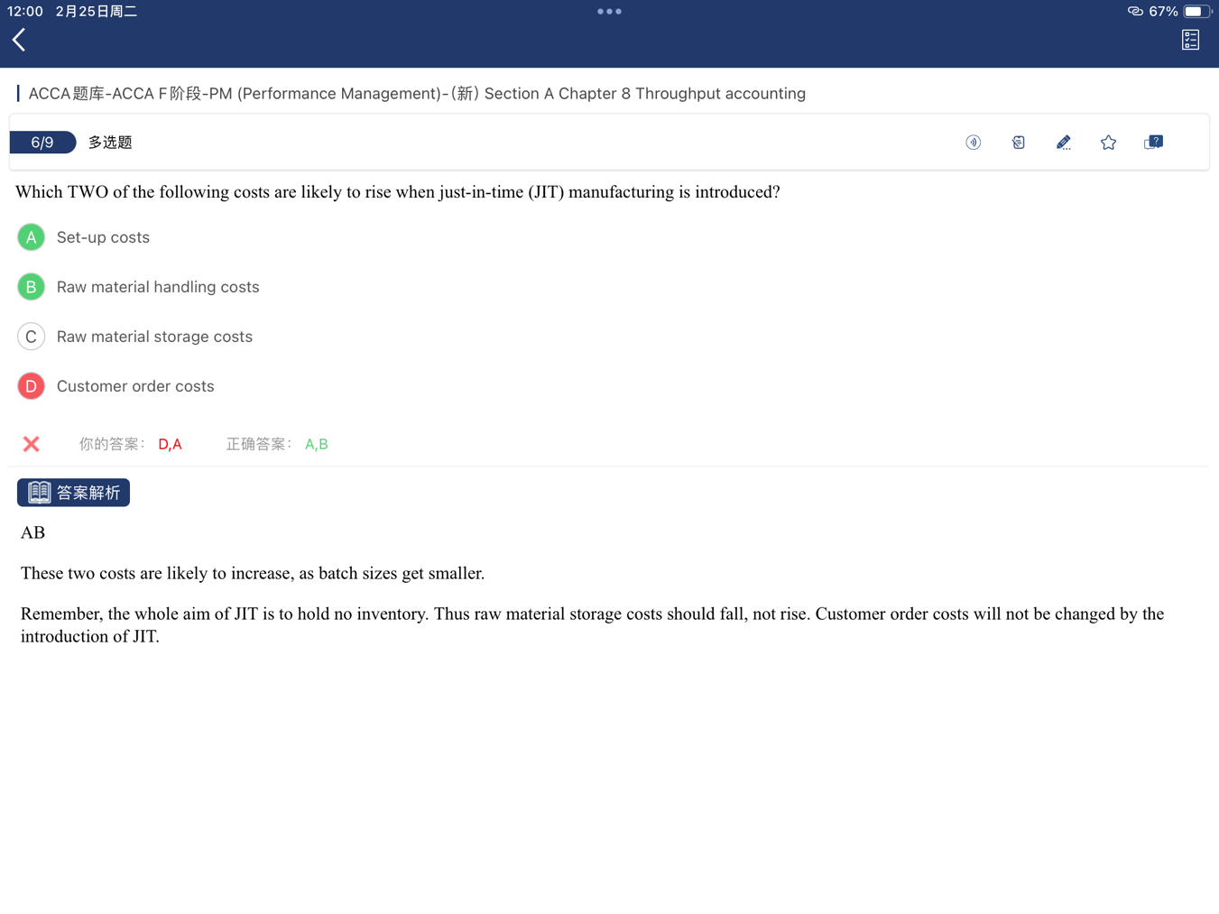 同学,如果引入即时存货系统,哪些成本会增加?set up设备启动费,来一个订单启动一次,肯定会比之前批量生产启动的次数多,会增加;原材料处理成本也是同样会比之前的次数多,会增加;原材料储存成本会降低,因为是0库存,减少库存;客户订单处理成本是跟之前一样的,不会变化。
