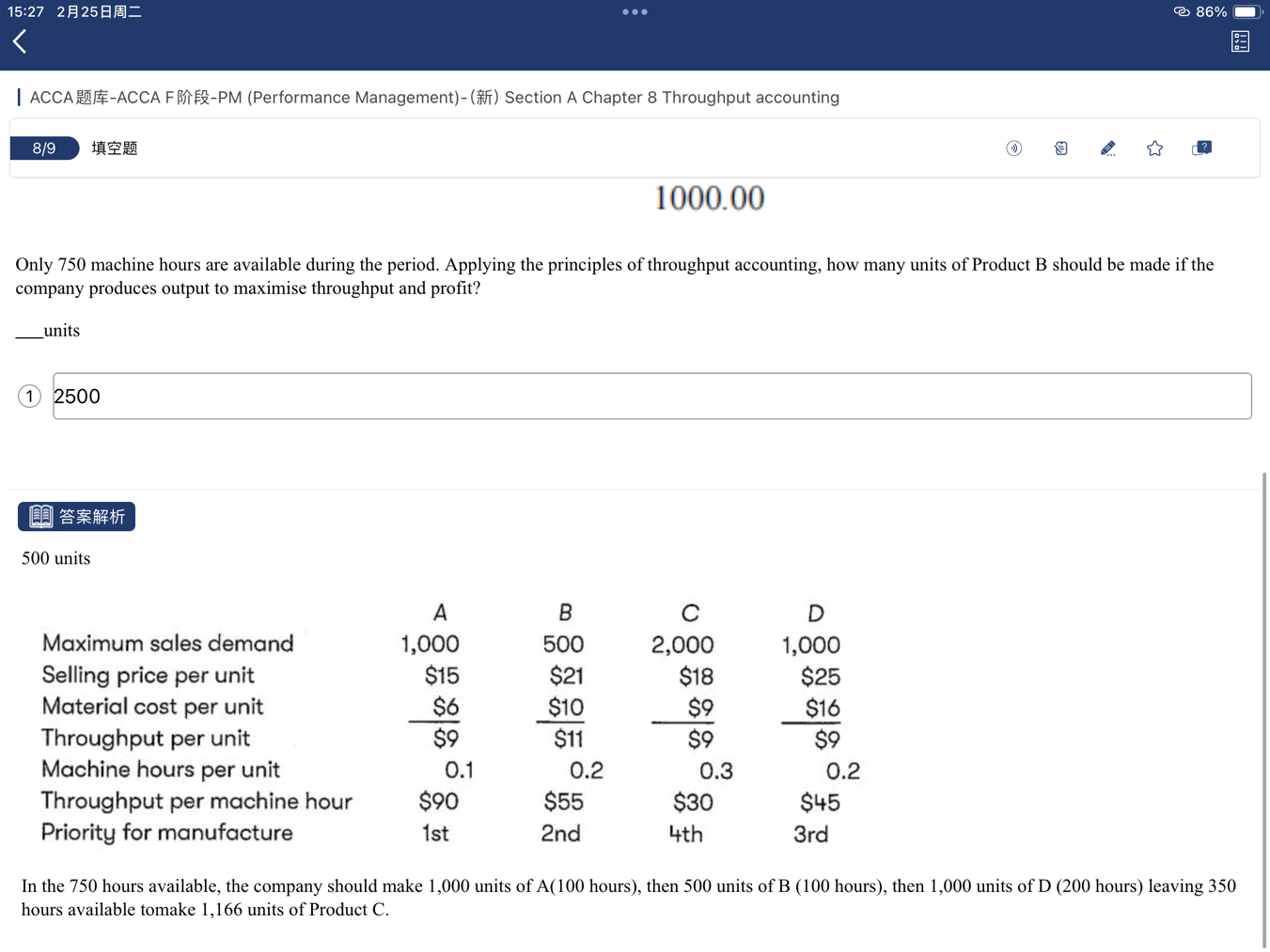 同学,描述的是:现有750小时可用的话,公司应该先生产1000的A,再500的B,最后只能生产1166的C。