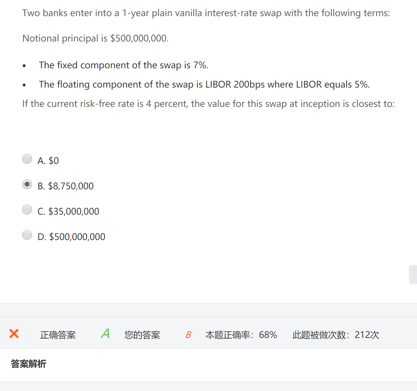 floating rate是libor+200=7%,而fix rate=7%,两者利率相同,所以是0
