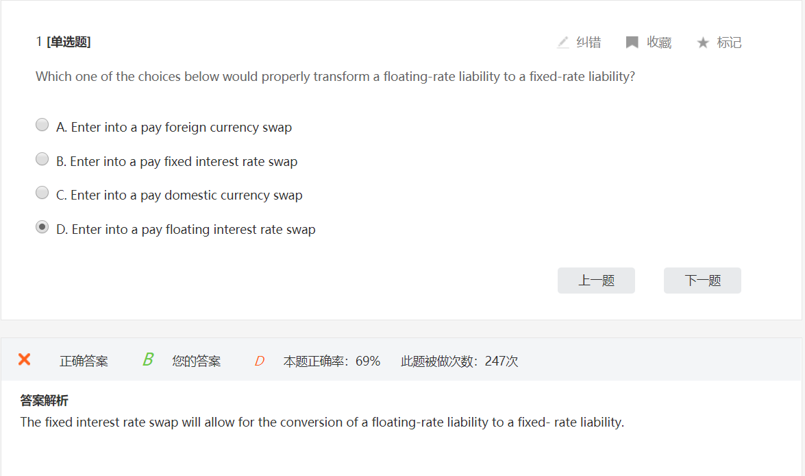 题目问的是如何将浮动利息负债转变为固定利息的负债,说明她先前支付的是浮动利息,现在想想支付固定利息啊。所以是支固定收浮动。