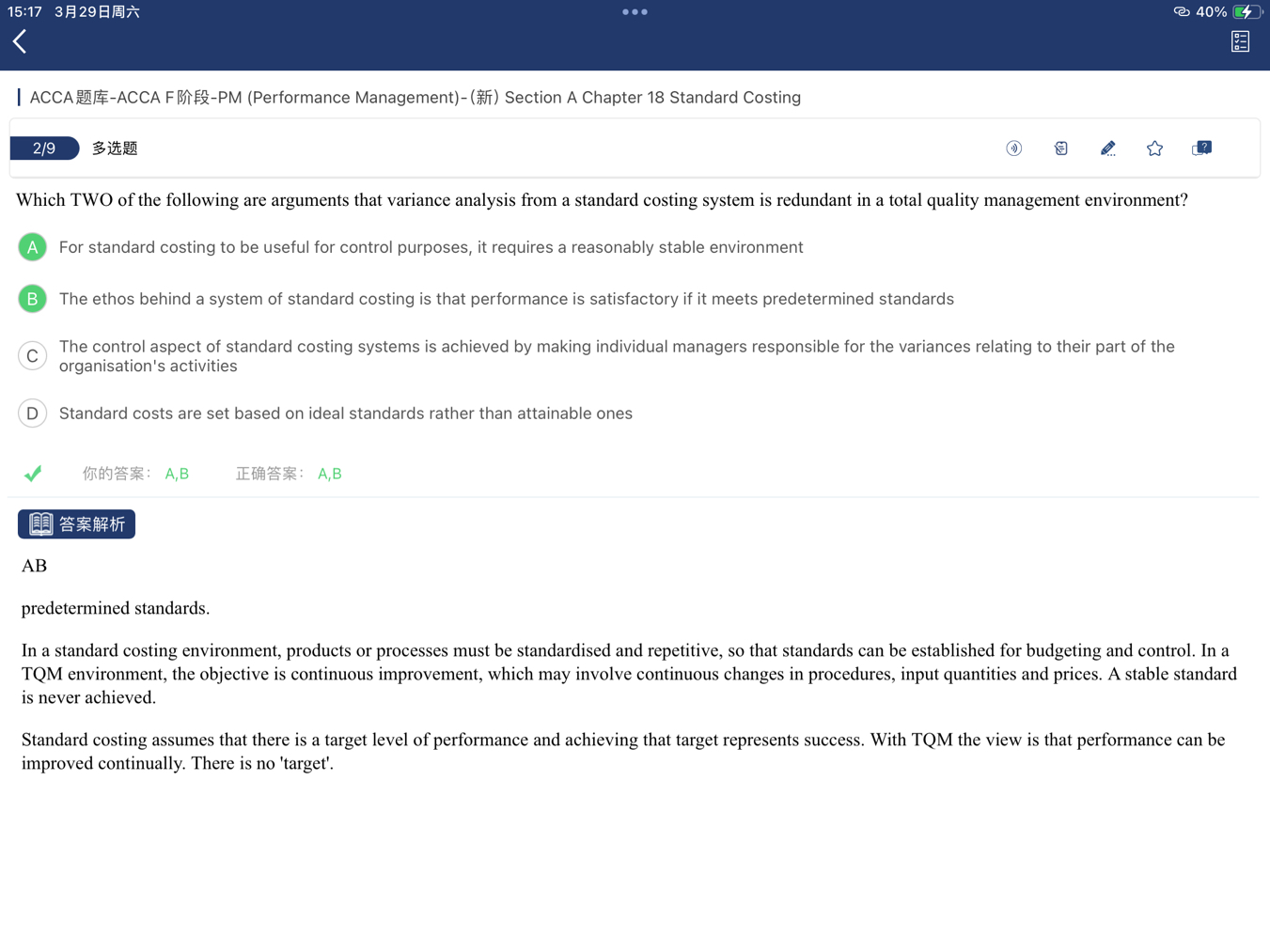 同学,TQM要求的是不断的提升,那么就没有所谓的target终极目标,那么控制就没办法说具体是谁的责任。standard cost基础是可达到目标attainable。