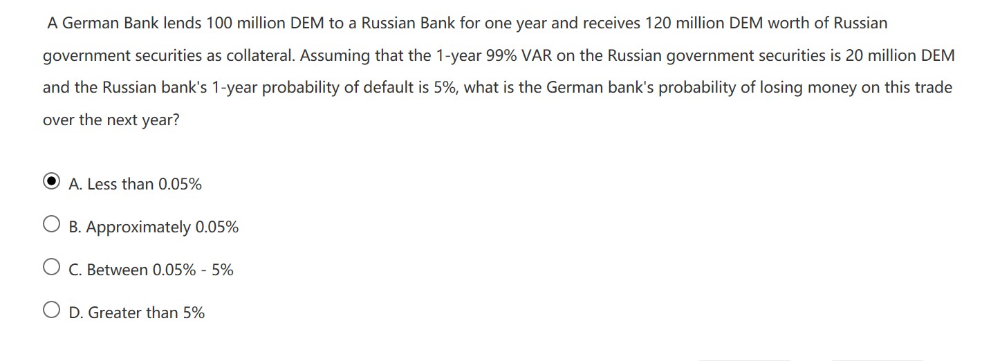 99%VAR是单尾,意思是1%的可能出现20M以上的损失。 银行出现loss是指抵押物估值低于100M,且俄国银行违约的情况下发生,则是在1%*5%=0.05%的情况下,抵押物刚刚足值100M,所以低于0.05%的情况下,银行会产生loss。