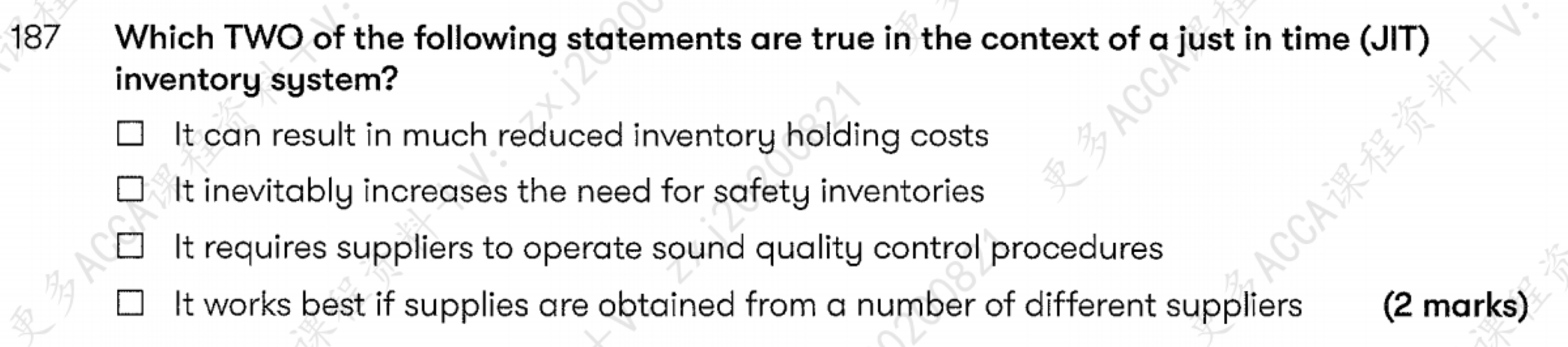 同学,B 描述要增加安全存货,JIT是要0存货的;C要求供应商对其运营有很好的控制,是对的,这样就会导致公司能快速且高质量的提供原材料,才能生产高质量的产品;D描述如果有大量不同的供应商会很好,是错误的,有关系好,反应快,质量好的供应商一个或者两个就好了。