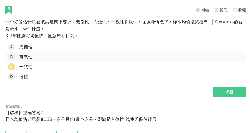 同学你好,这道题题干最后问的应该的是对均值估计量,BLUE性质最不可能意味着什么?,这边已经修改,而BLUE符合无偏性、有效性、线性,唯独不满足一致性,所以答案选C。
