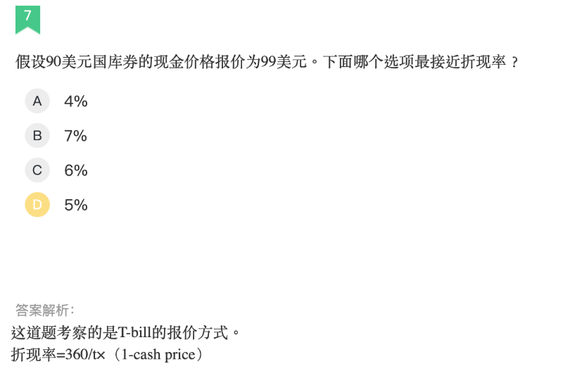 美国国库券(期限小于1年)通常是以贴现率的形式进行报价,比如 这道题通过公式 极端出来的4【360/90*(1-99)=4】就是其报价,其意思就是以4%的折现率进行报价。