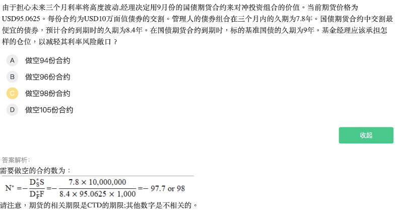 同学你好,1000万是题干中缺少了一个信息,即第一句话应该是“由于担心未来三个月利率将高度波动,经理决定用9月份的国债期货合约来对冲投资组合的价值10million”,解析中的1000,是8.4x(95.0625/100 )x 1.00000化减而来的,95.0625/100代表报价 95.0625为100的百分比乘以一份国债期货合约面值10万即为一份面值合约的实际价格是多少 。