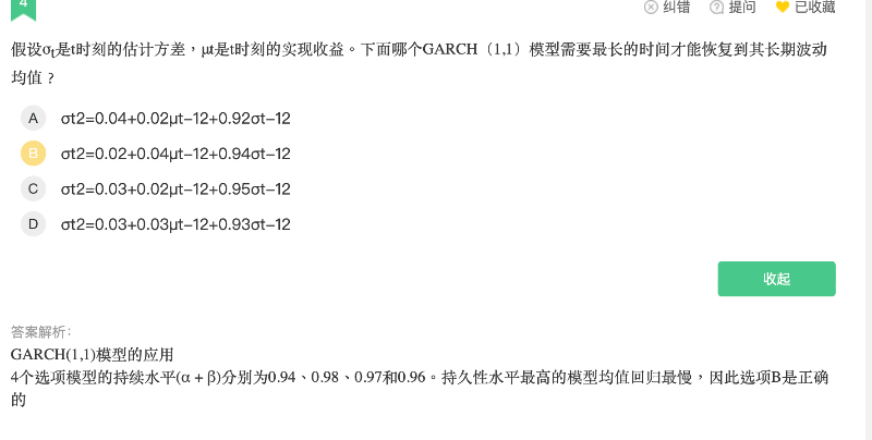 这些就是每个模型等式中阿尔法+贝塔结果的结果,即t时刻的收益均值系数和波动率系数之和,比如A选项中,0.94=0.02+0.92,其他选项同理。