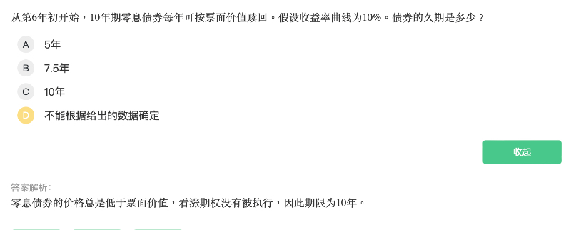 因为零息债的价格不会高于面值,而执行价格又是面值,所以永远不会行权赎回,既然不会行权赎回(包括后面的6-10年),那么这个可赎回债券就相当于是一个不含权的零息债,而零息债的久期就等于其自身期限10年。