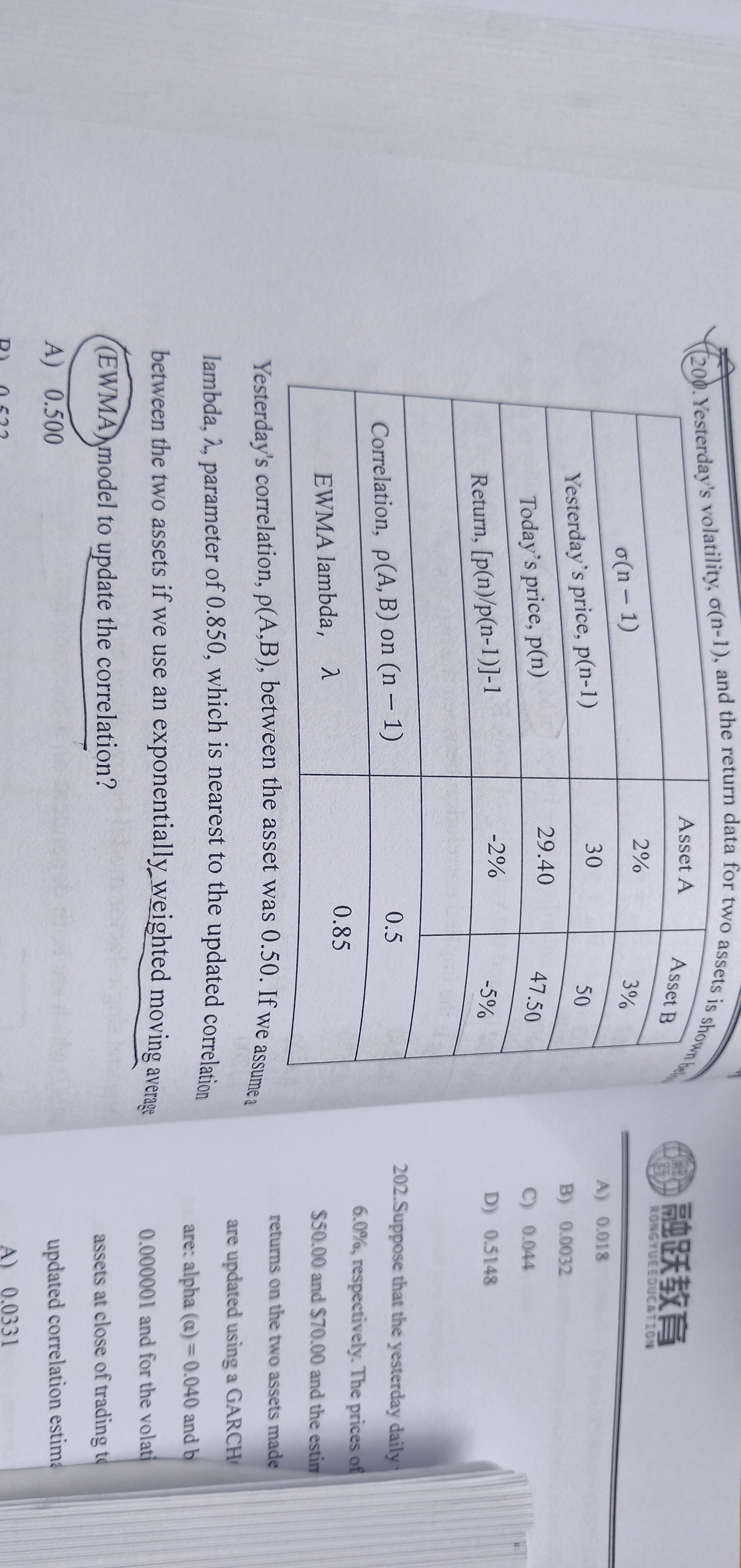 这个再notes和视频讲义中都讲过 是FRM的核心知识点 必须掌握 这道题是考试对EWMA基本公式的掌握 我建议您先去了解一下此公式的含义和其中的要素 这样就比较容易李姐此道题了