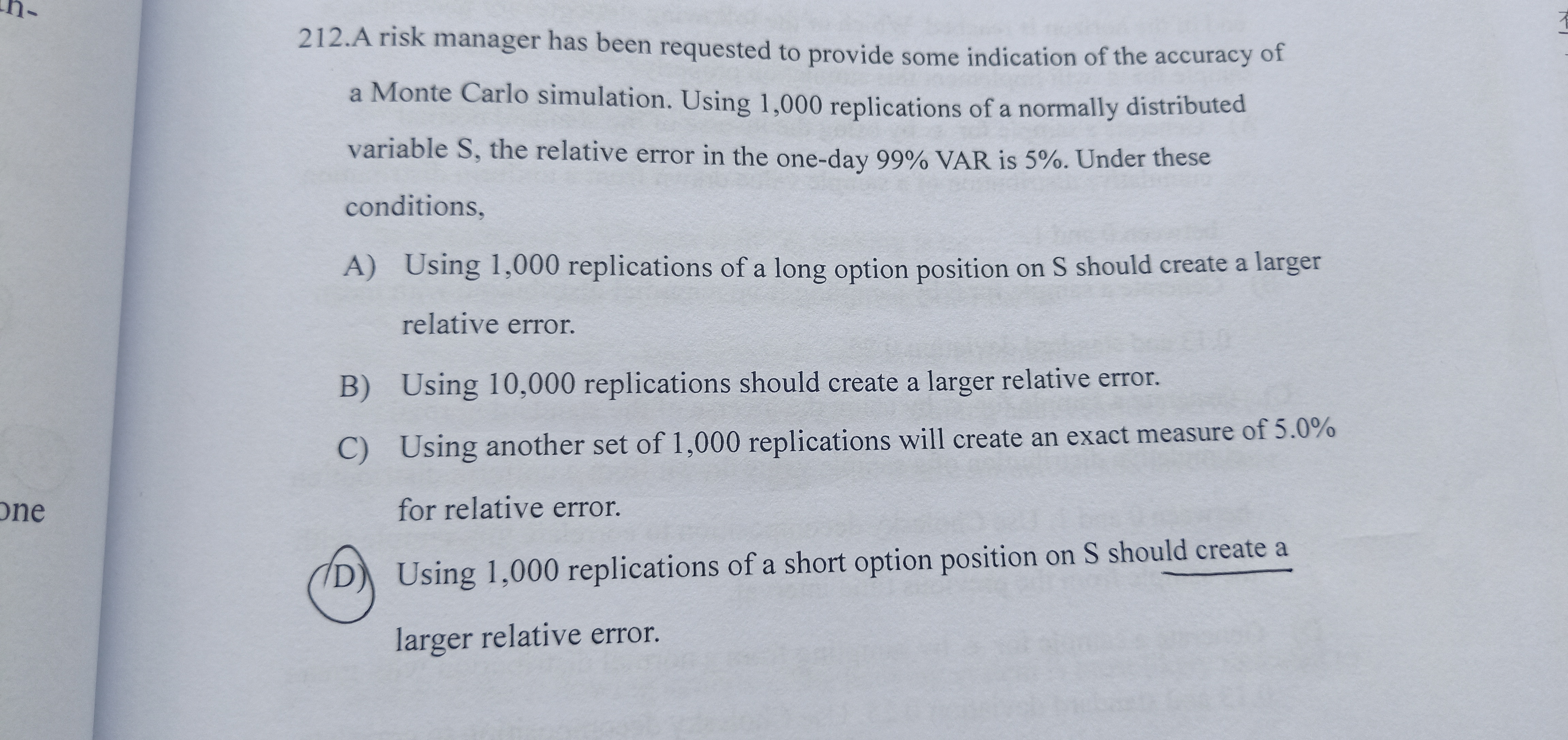 蒙特卡洛模拟中,如果首次测试1000次,那么测试数量越多,准确度越高,所以B是错的。 如果再进行第二次1000次的测试,也不可能得出的结果和第一次完全相同,所以C是错的。 AD选项都是对option进行1000次测试,但是一个是long一个是short,而short测试的error和long的相比更大。