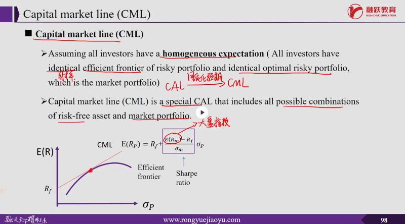 2. 再来看CML线各个部分所代表的含义,首先是与纵轴交点,此处该资产组合配置当中只有无风险资产,随着向CML线往右上方走,无风险资产比重下降,同时风险资产比重上升,到了切点处就是全部配置的风险资产(即市场组合),然后再往右上方走,即切点右上方的所有区域都是对风险资产的超权重分配,即通过卖出无风险资产(即以无风险利率借钱)同时买入风险资产。