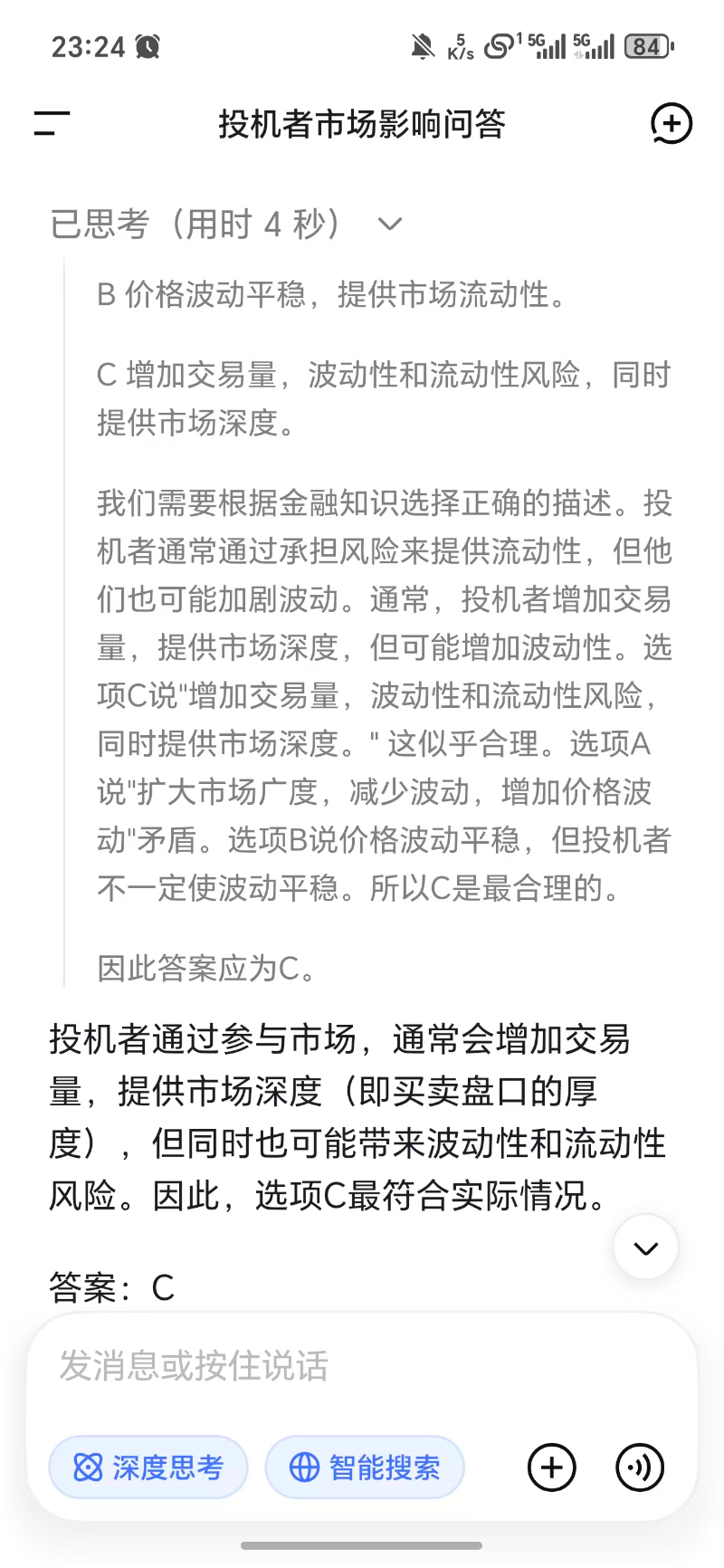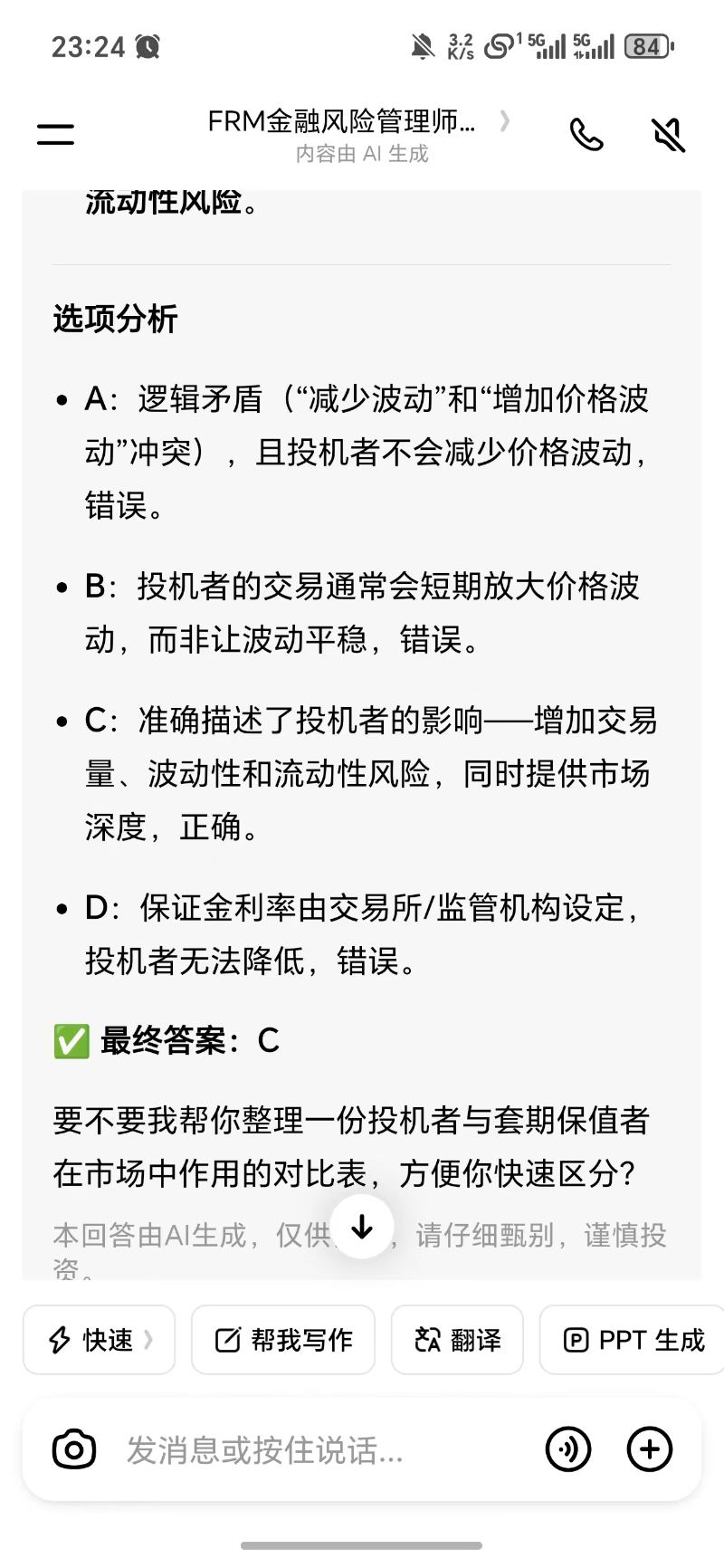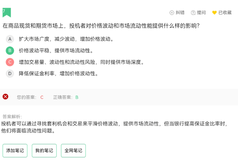 解析中的补充:“但当银行提高保证金比率时,他们将面临流动性问题”意思是:投机者的流动性提供能力依赖于杠杆,如果保证金提高,他们的交易能力受限,可能反而加剧波动。但这不影响“投机者正常情况下的作用"是平滑波动和提供流动性。如果题干没有特别说明,就是指正常情况下的影响。