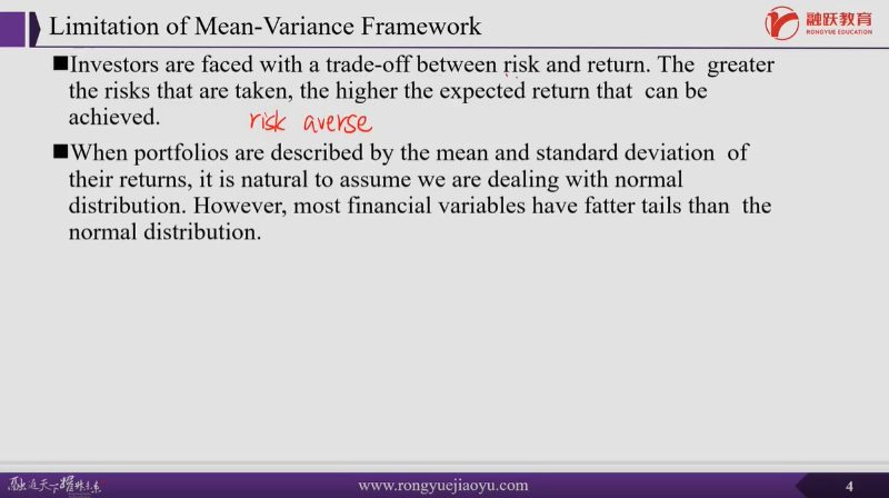因为VAR的计算必然要涉及到mean-variance框架,算是一个内容回顾和铺垫(其实第一门风险管理基础科目已经学过),这个框架的3个缺点自然也体现出了VAR指标的缺点,因此要事先做提醒。