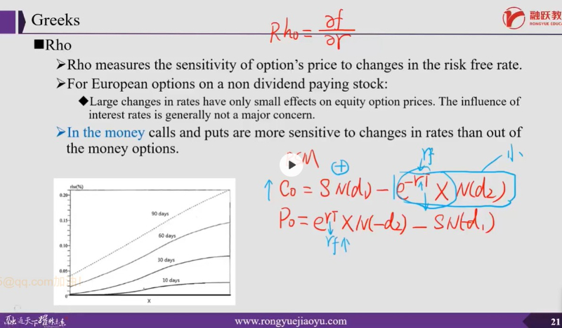 你的困惑是对的:确实通过折现和概率两个方向影响Co,其中概率效应的内部还有拉扯。但数学求导证明(即希腊字母rho,代表看涨期权价格对无风险利率的敏感程度),净效果是正的一一利率上升,看涨期权价格上升。原因是:看涨期权本质是“延迟支付"的权利,利率越高,未来要付的行权价在今天越不值钱,这个权利就越值钱。