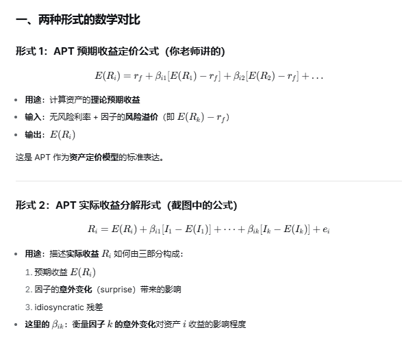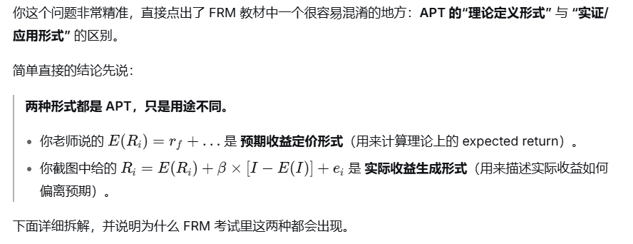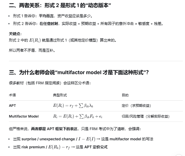 请问可以重新写一下FRM中通常会用的APT, Multifactor model和Fama french model的公式吗?我发现课件上的和notes里的都不一样