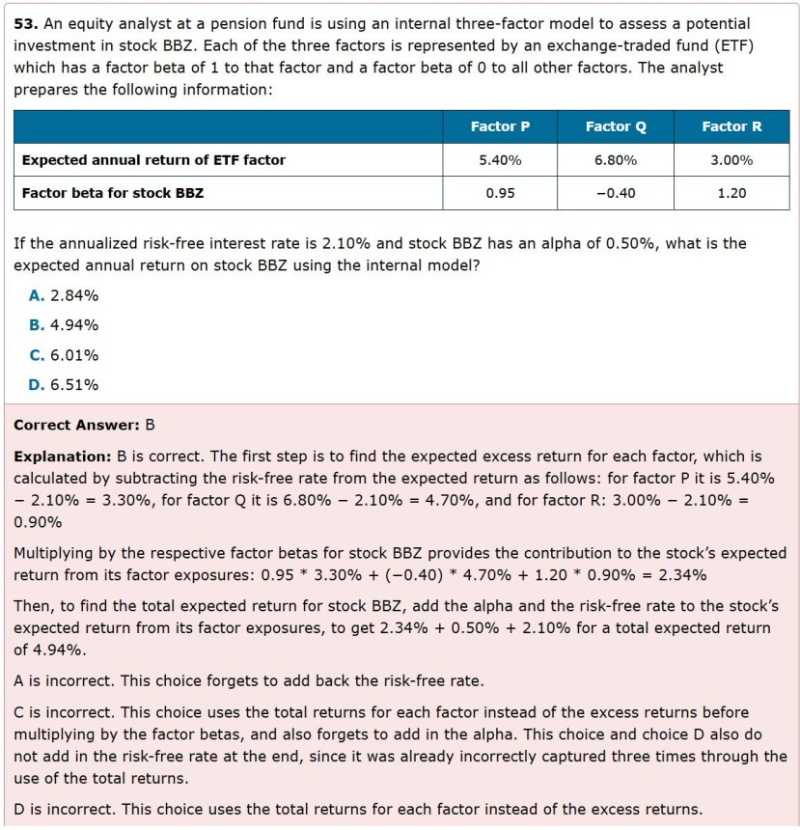 这道题其实就是Fama-french三因子模型的一种,因变量和自变量都是预期回报减去无风险利率,然后做回归,截距项就是超额收益,只不过这里的因子不是Fama-french三因子模型的三个因子,但逻辑是一样的。这个跟多因子模型不一样,多因子模型是实际回报减去预期回报之间进行回归,没有截距项,做题时要灵活应变,根据题干信息进行变动,这道题有无风险利率和超额回报,那就套用Fama-french三因子模型就行。
