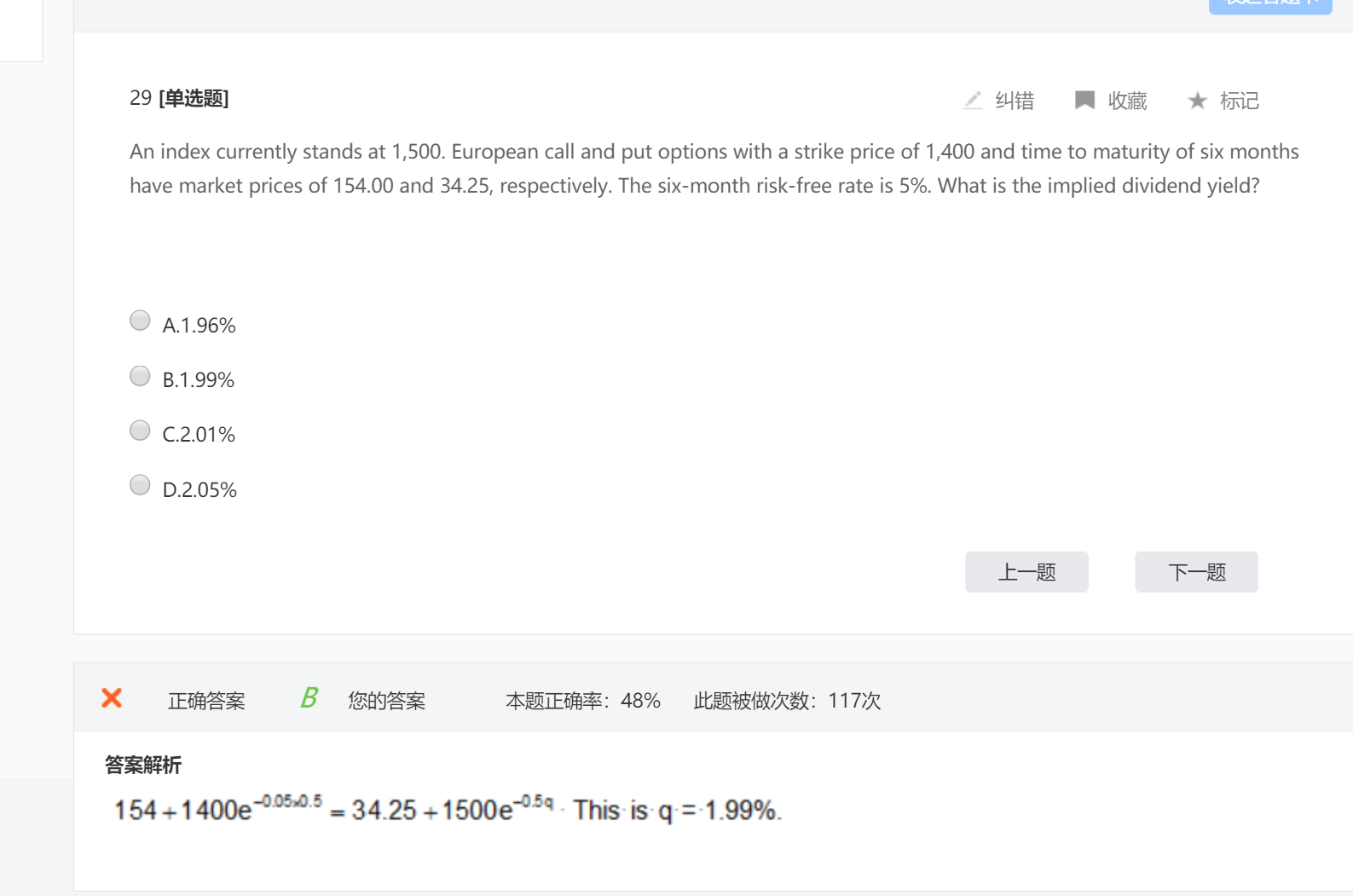 dividend yield对现货价值是有影响的,会降低现货的价值,所以在计算的时候要e的(-q*t)次方,然后再用put call parity公式计算即可
