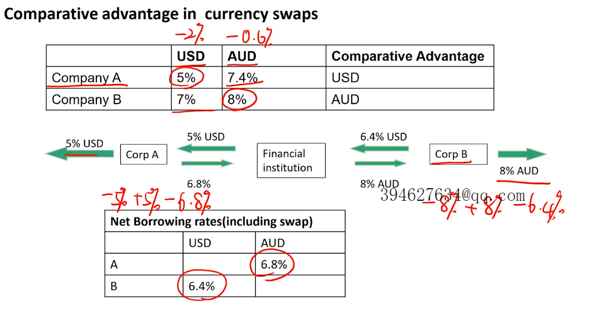 这个流程图中间的financial institution就是中间商 你看一方面他收6.4%,付5%,就留存了1.4%,另一方面,收6.8%,付8%,多支付了1.2%,如此一来,他就净留存了0.2%当做自己作为中介的收费了。