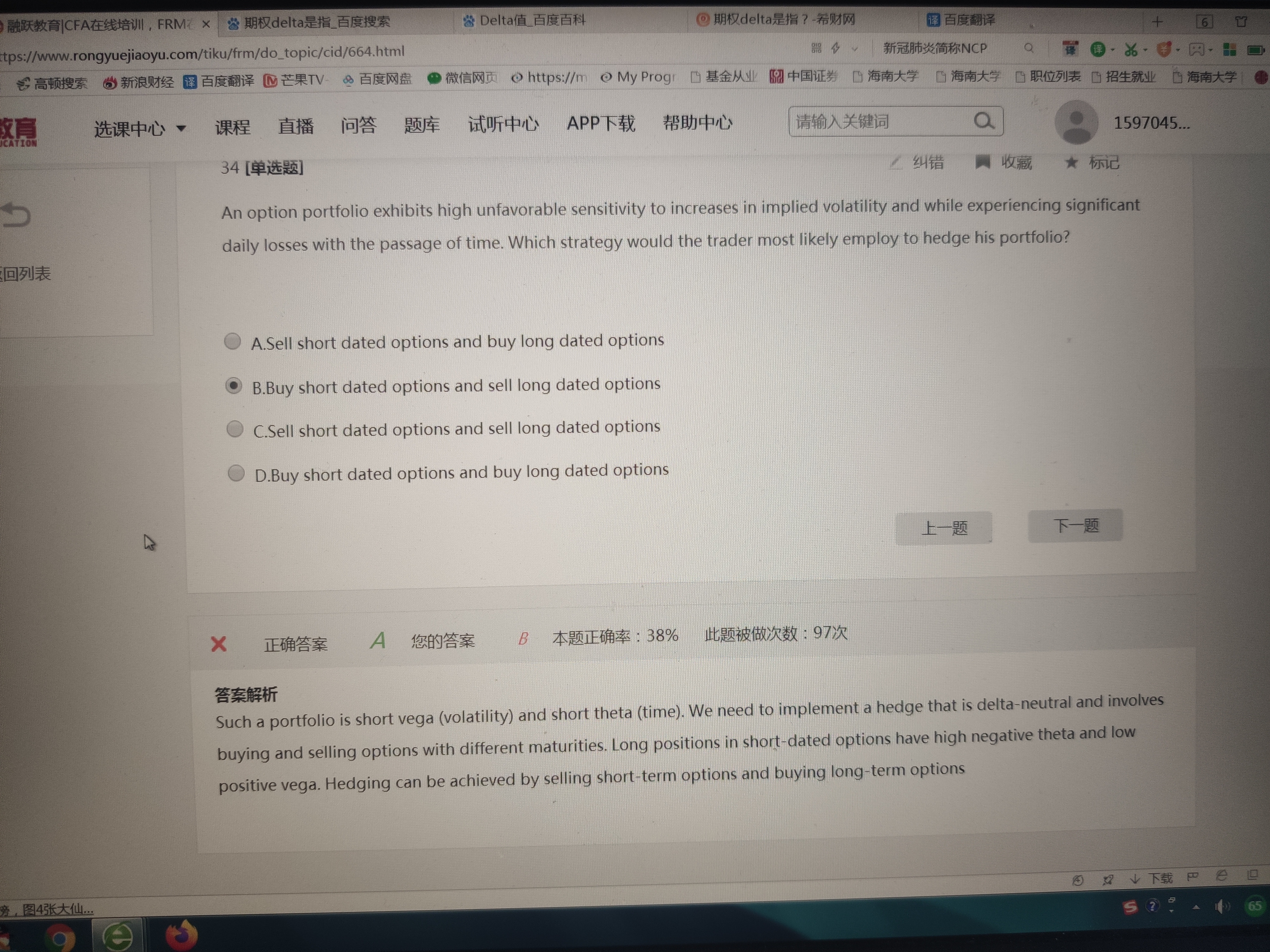 题目说的是组合对隐含波动率非常不满,那就应该降低他的波动率,难道不是买入短期的然后卖出长期的来降低波动率吗?