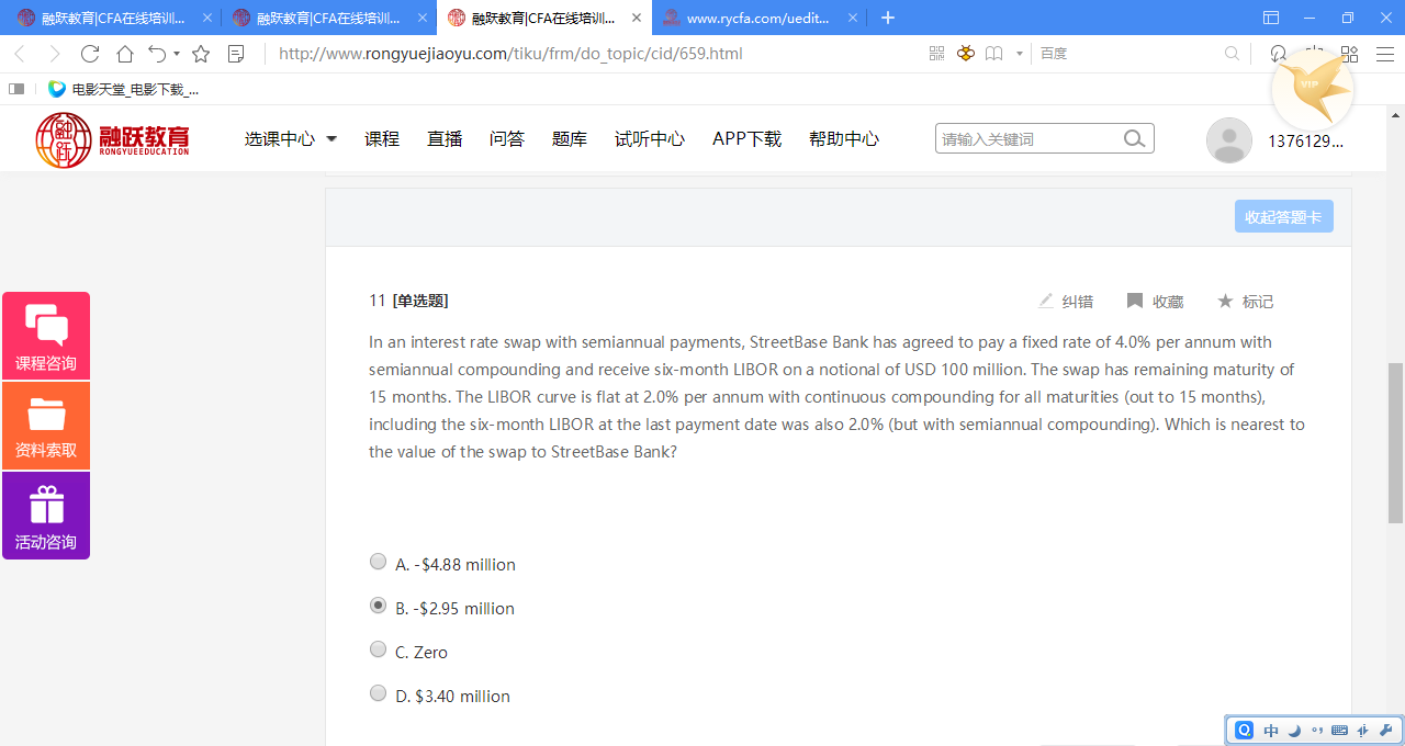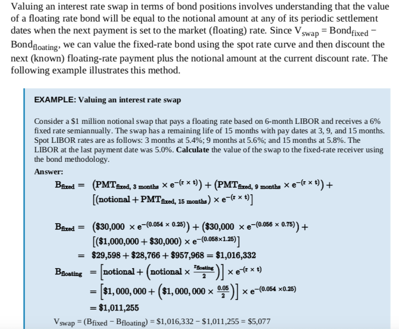 先算fixed价值,每期2的coupon,6个月一期,但是初期为上次付息的三个月以后,所以离下次付息还差3个月,所以三次折现的CF为2、2、102,折现时间t为3/12、9/12、15/12, 算出PV为103.44 再算floating价值,这个floating价值计算建议你看一下我下面的截图,你就明白为什么这么算了。仔细看截图最上面的那段话。 两个价值都算出来后,差额就是swap 的价值了。