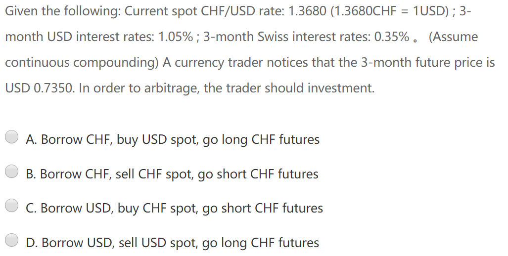 把斜杠后面的看作货物,usd远期价格被低估了,chf就是高估,所以chf的future要做空,chf的spot要做多。