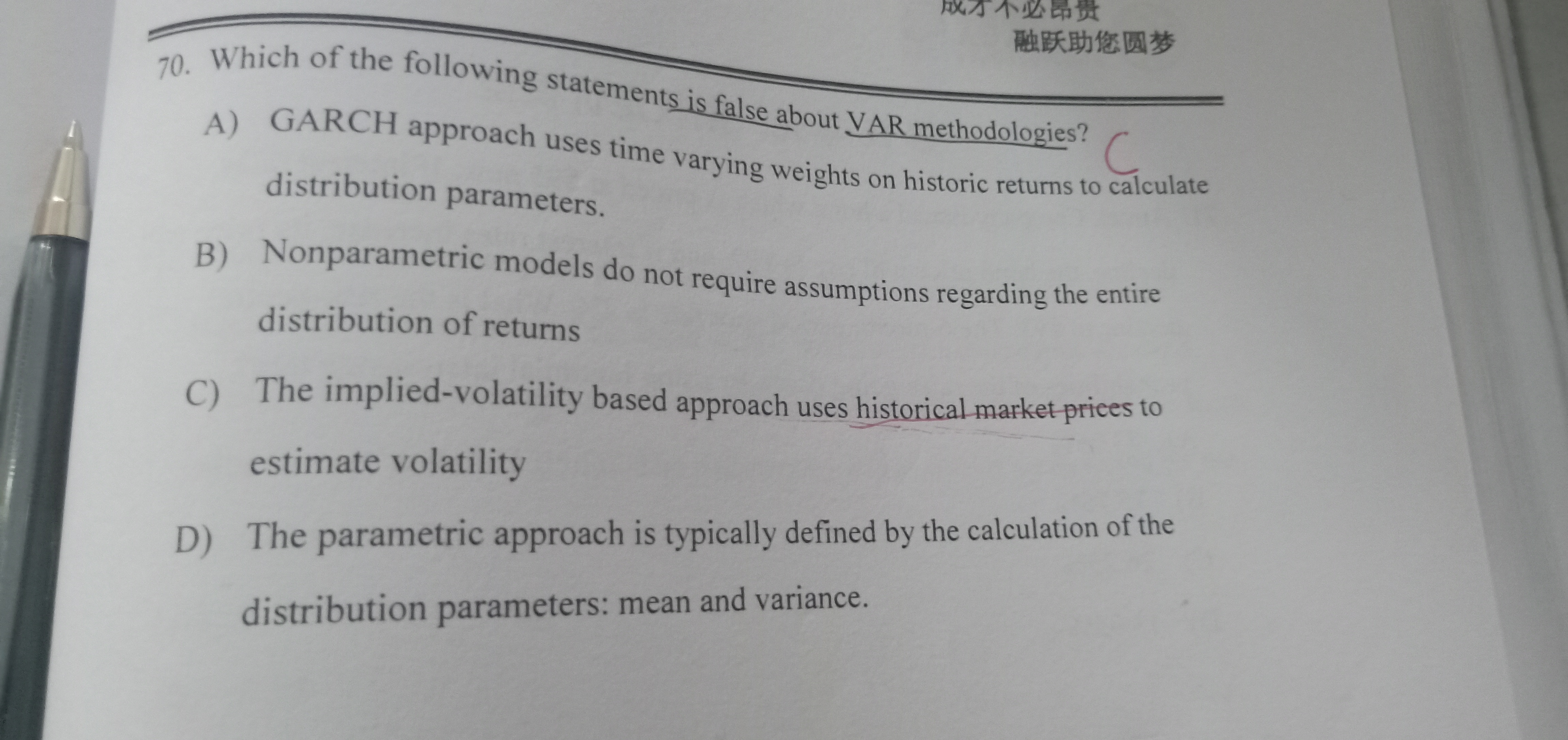 AB本来就是对的啊,A,GARCH对历史数据赋予权重,B非参数方法不需要假设分布。